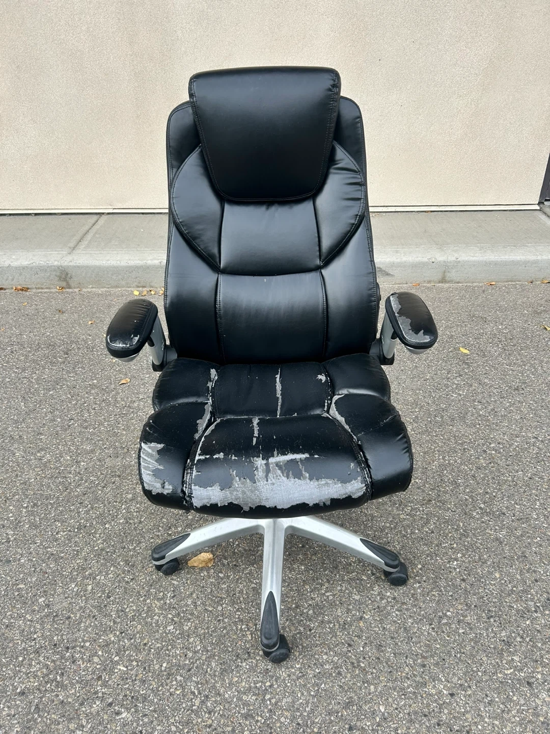 Selling a black executive office chair. As you can see in the photos, the seat and armrests have some wear and tear. Still functions well, though!