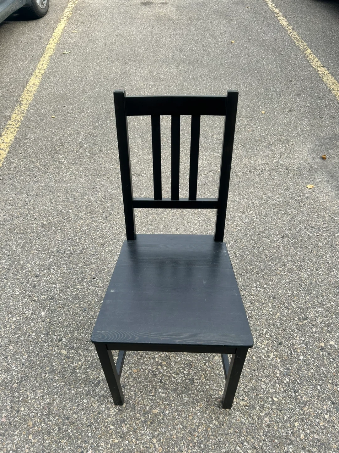 Selling a simple black wooden chair. It's in good condition and would be great for a kitchen or dining room. It has a classic design that fits well with many decor styles