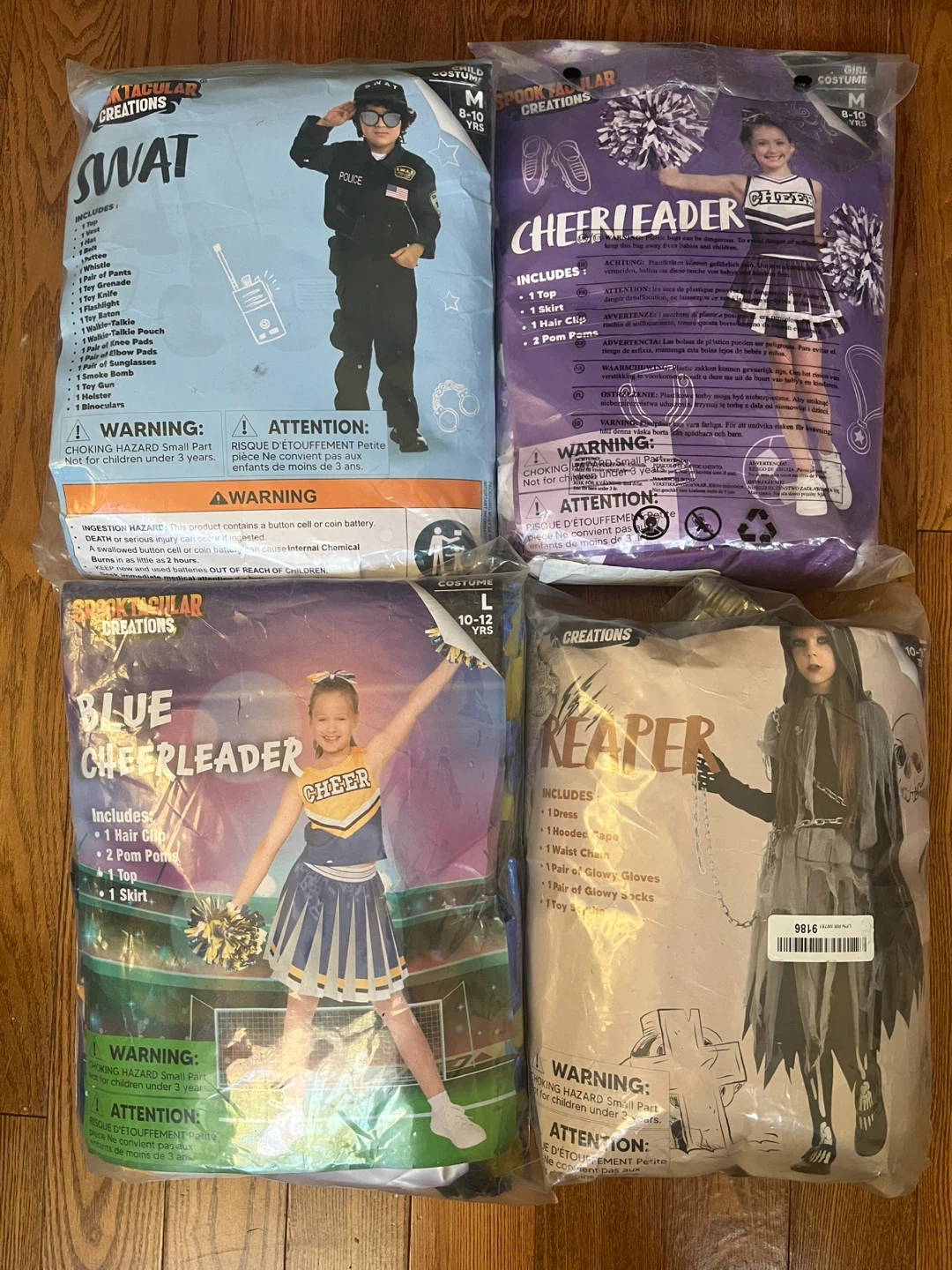 - SWAT (M 8-10 yrs): Includes top, hat, vest, belt, police badge, whistle, pants, toy grenade, toy knife, flashlight, toy gun, walkie-talkie, walkie-talkie pouch, knee pads, elbow pads, sunglasses, smoke bomb, gun holster, and binoculars