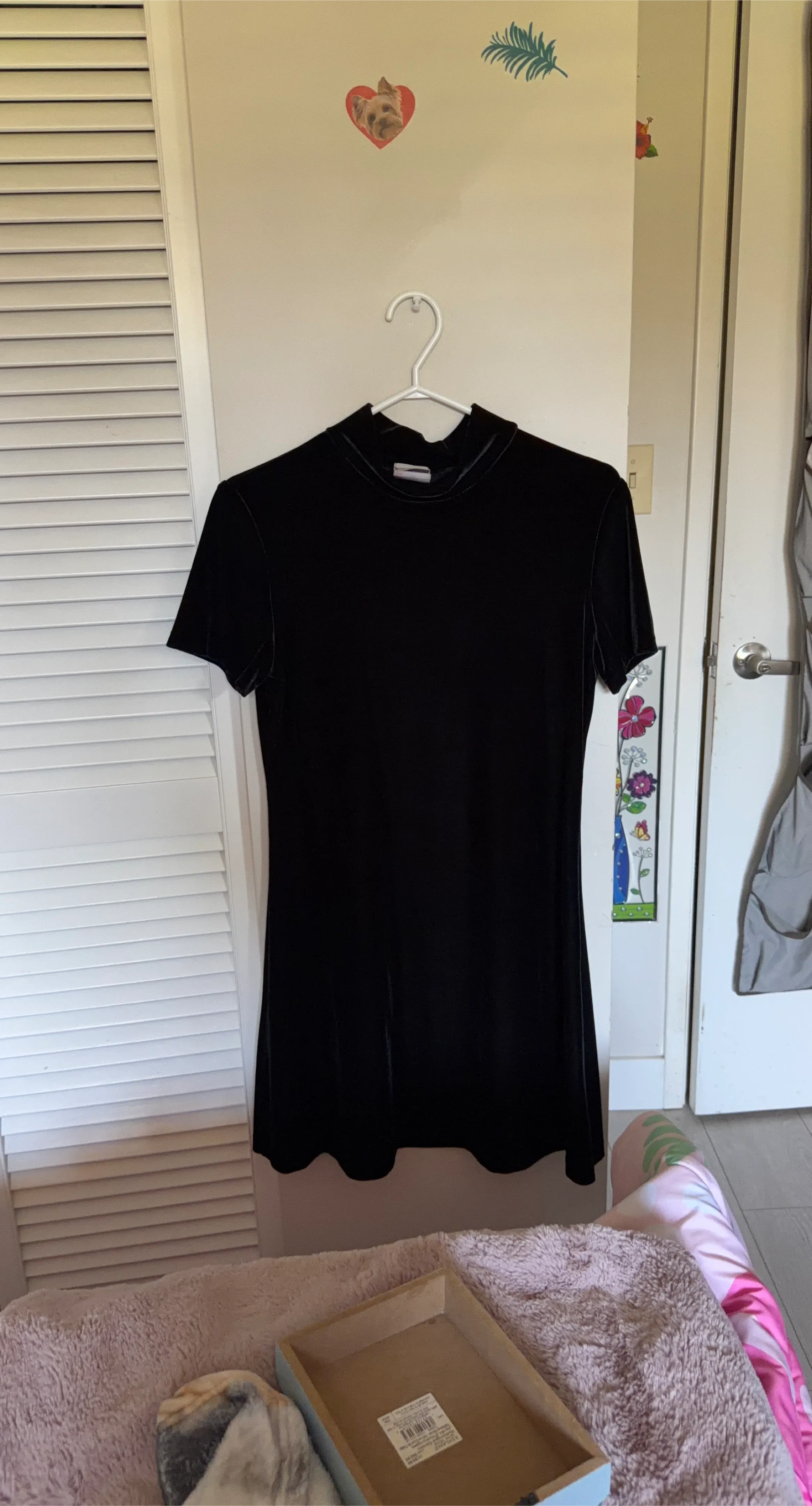 A cute black velvet mini dress! Perfect for a night out or a special occasion. It's in great condition and ready for a new home