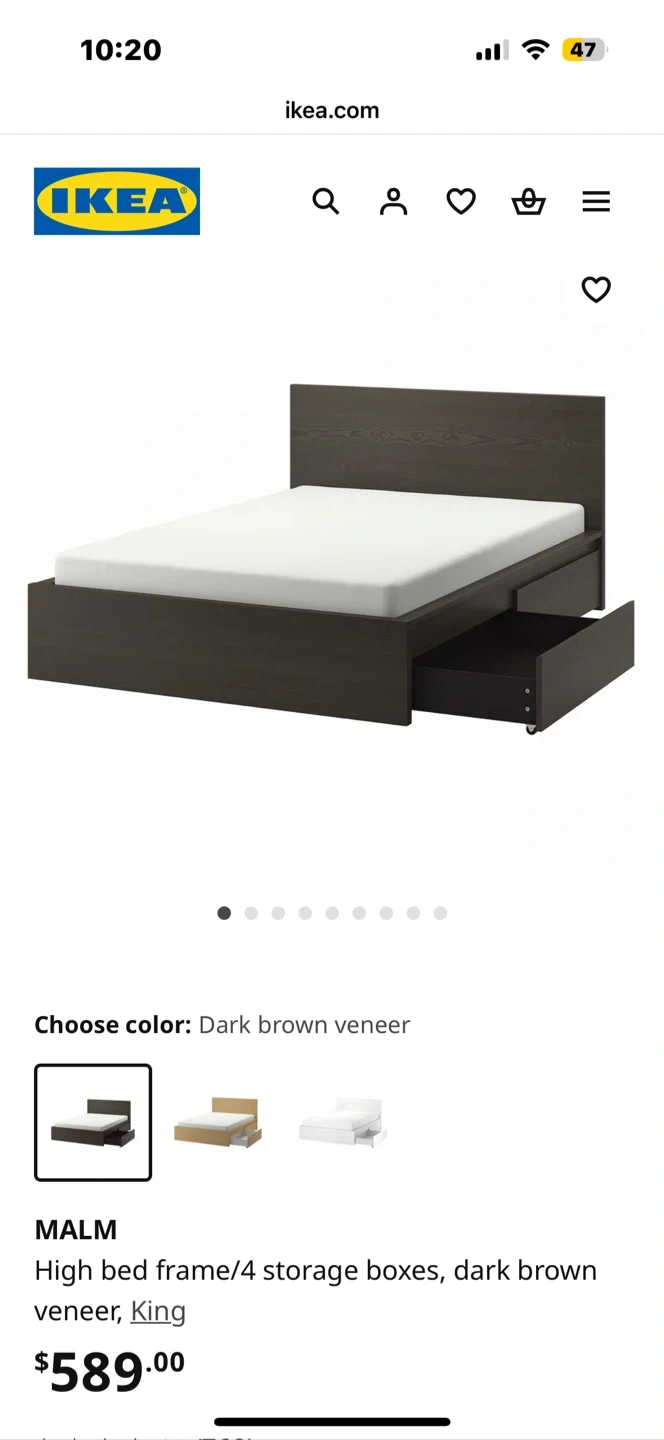 Selling an IKEA Malm king-size bed frame in dark brown veneer. It comes with four handy storage boxes built right in, perfect for keeping extra linens or clothes. The bed frame is in good condition and ready for a new home!