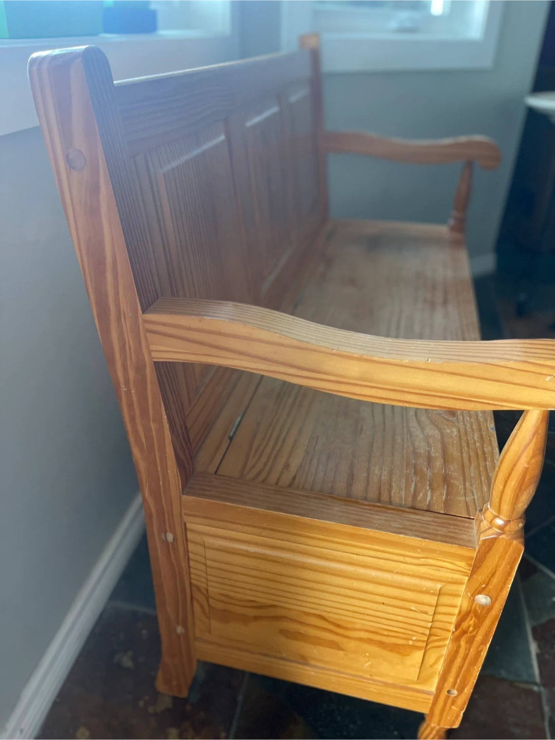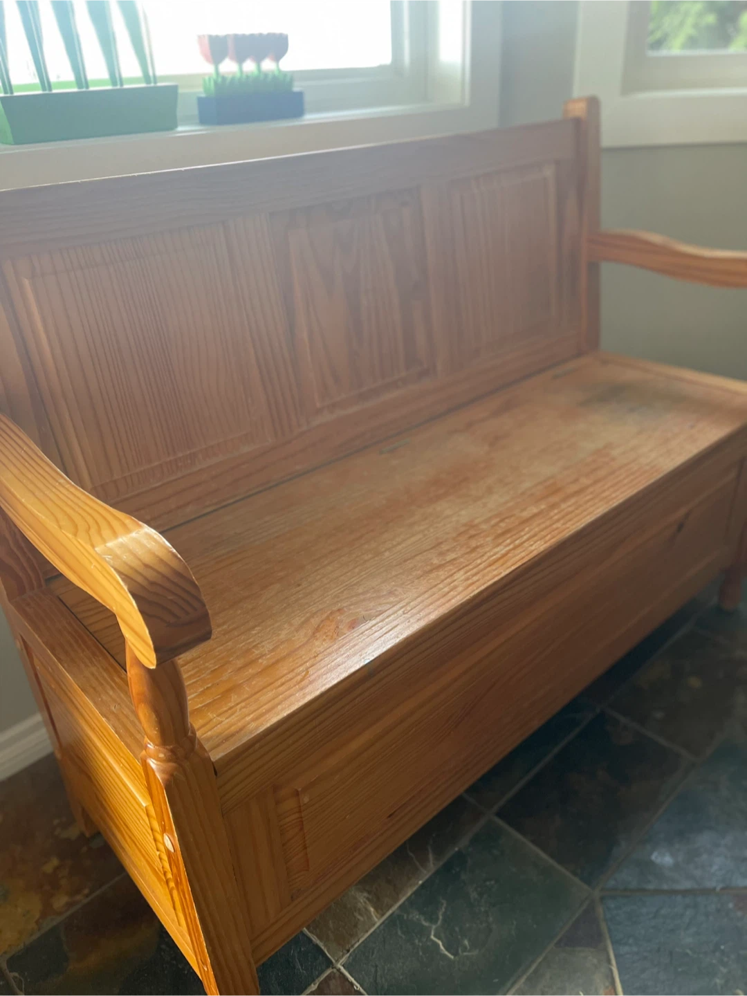 Selling a wooden storage bench! It's perfect for adding extra seating and storage to any room in your home. It has a natural wood finish and a classic design that will complement any decor. It's in good condition and ready for a new home!