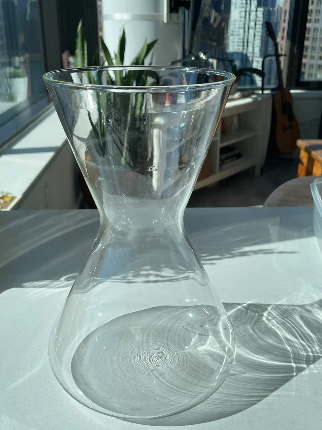 Selling a clear glass vase with a unique hourglass shape. It's in great condition and would look lovely with flowers or as a decorative piece on its own