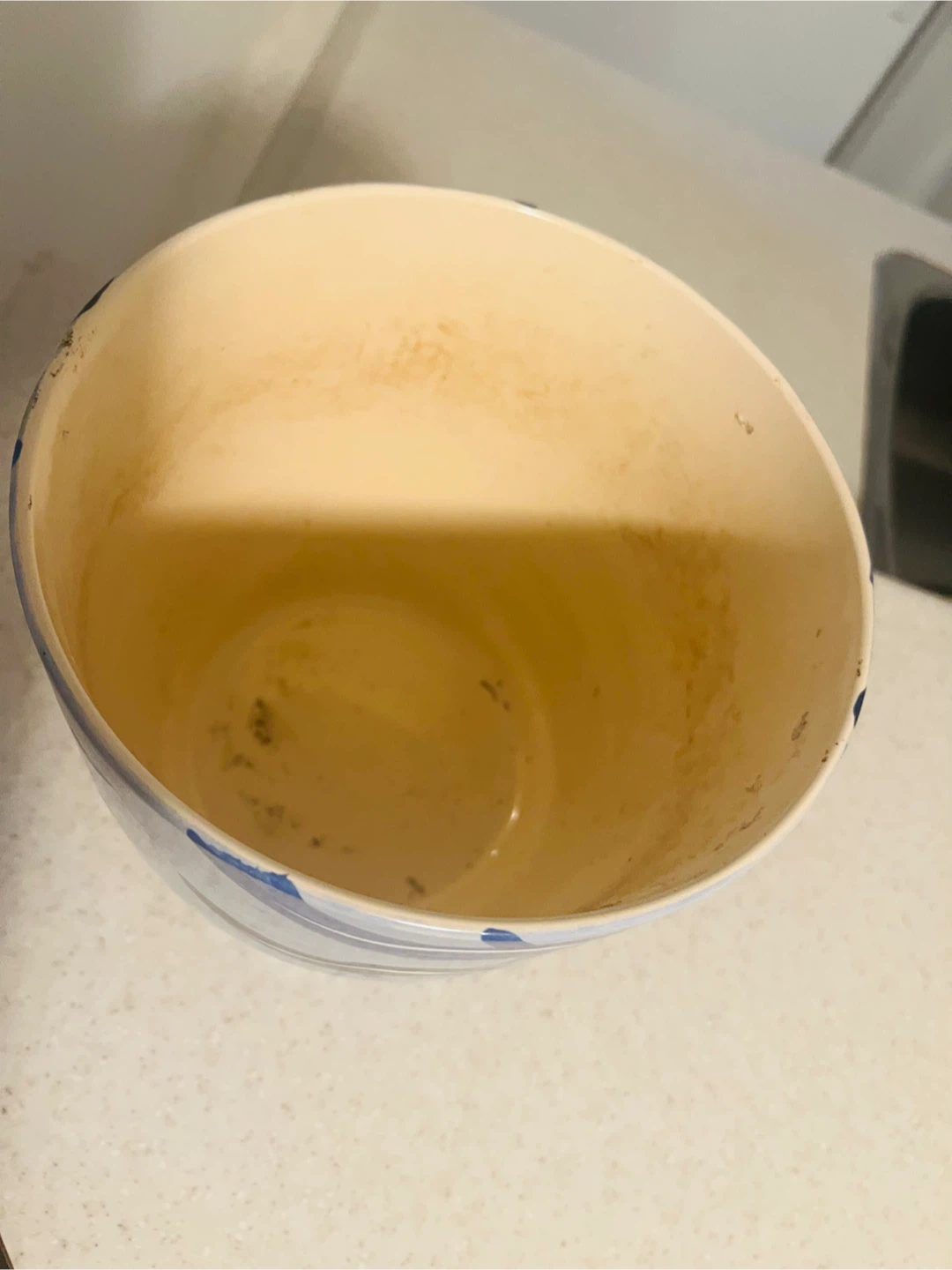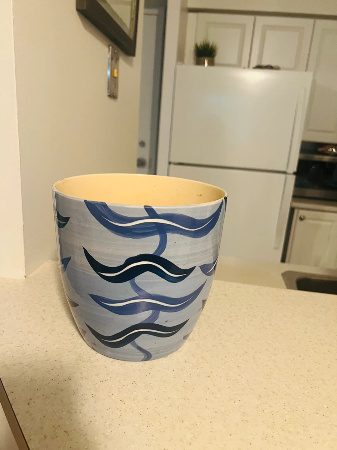 A lovely decorative ceramic plant pot, slightly used with a blue and white wave pattern! It's perfect for adding a touch of style to any room. There are some signs of use inside the pot because of soil.