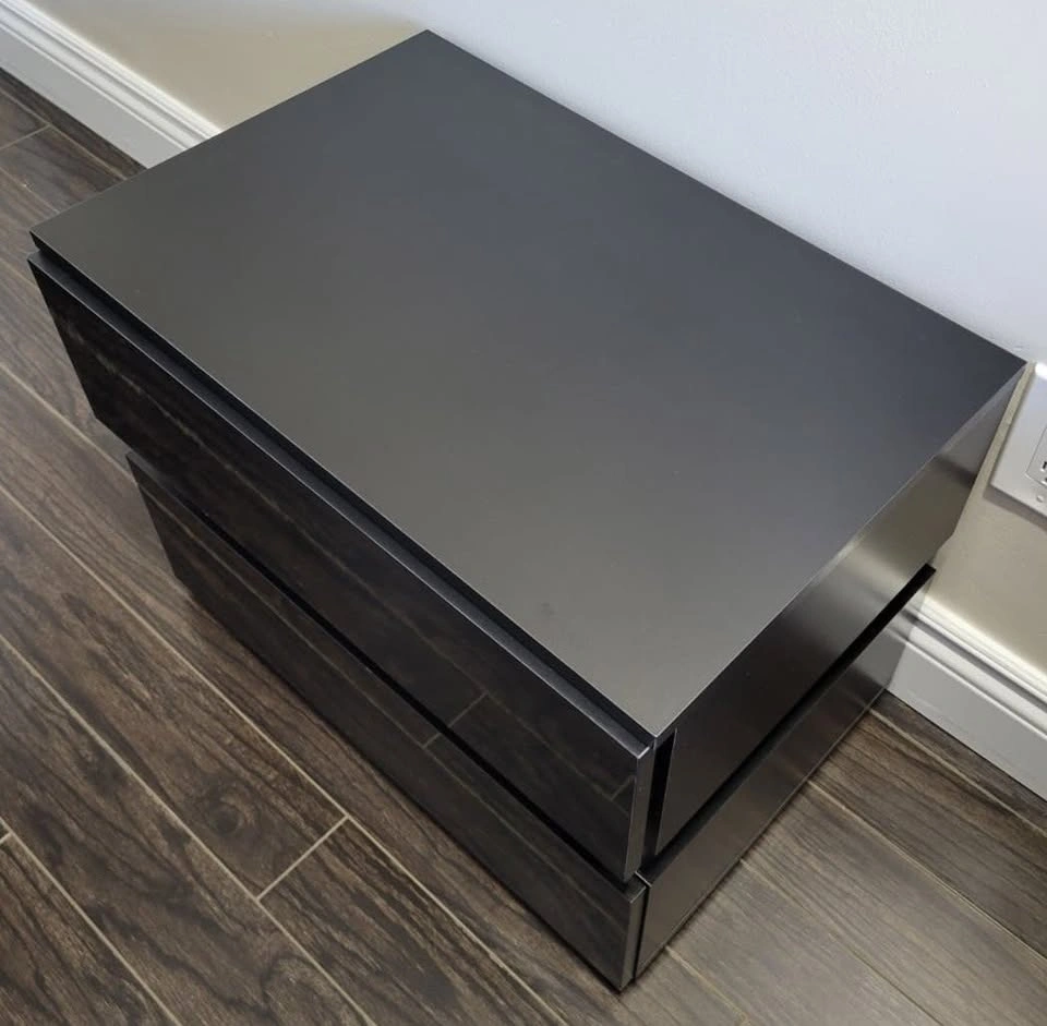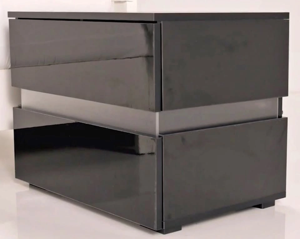 This is a Manningtree manufactured wood nightstand in a sleek black finish. Its modern, glossy design and spacious storage make it a practical and stylish piece for any home.