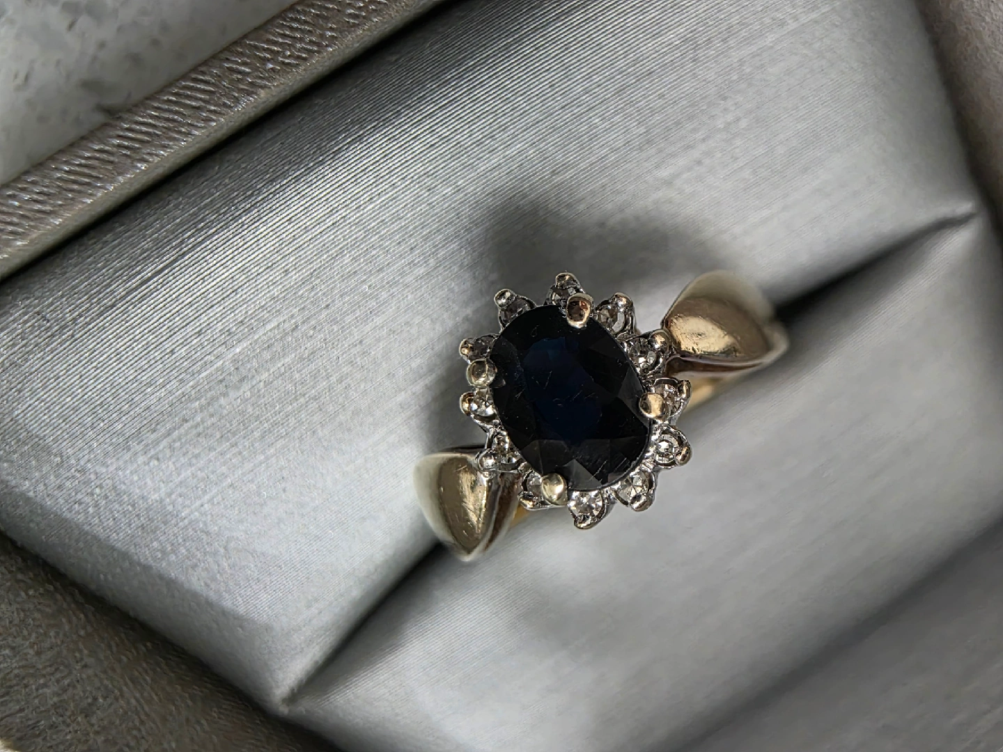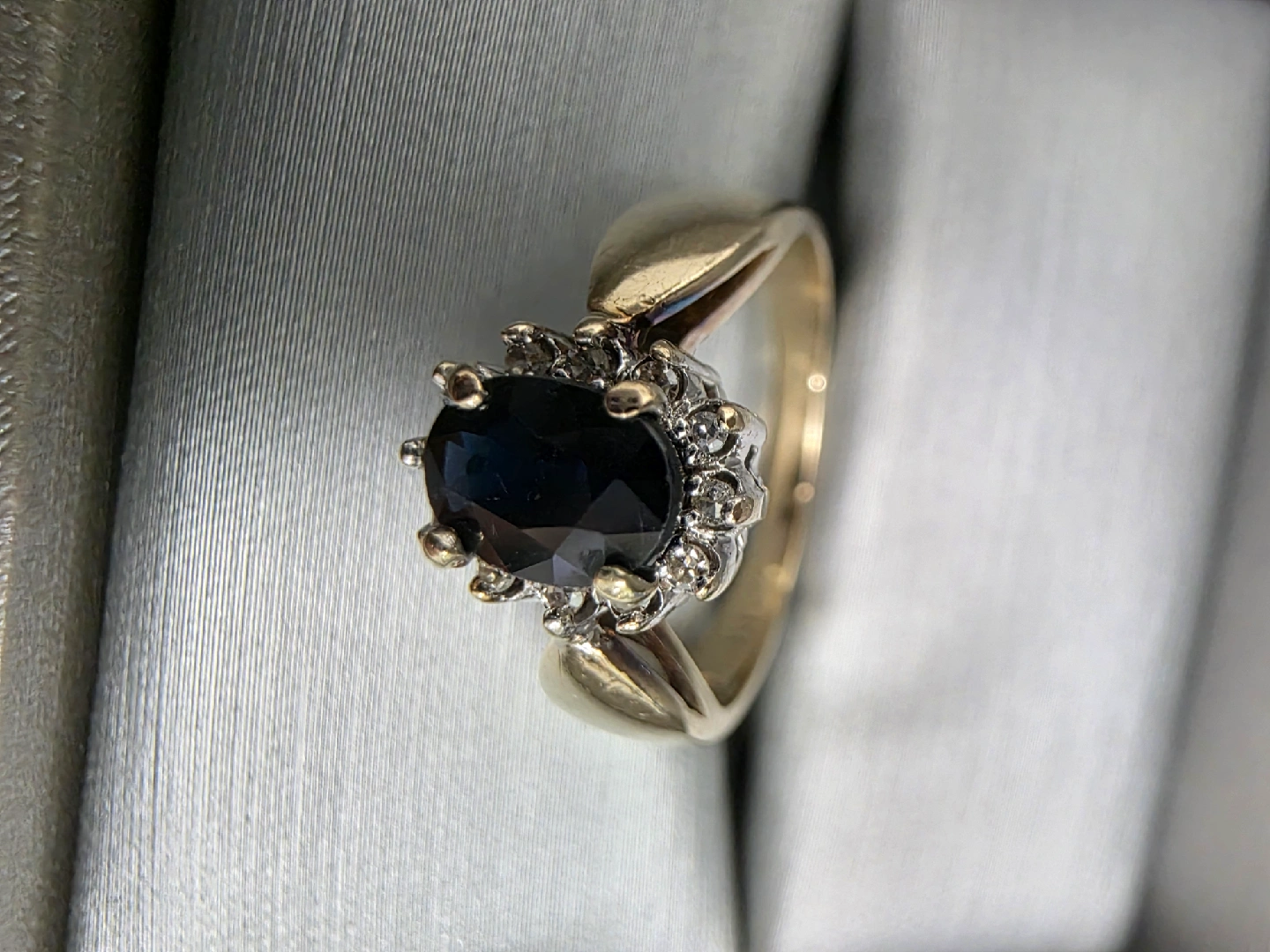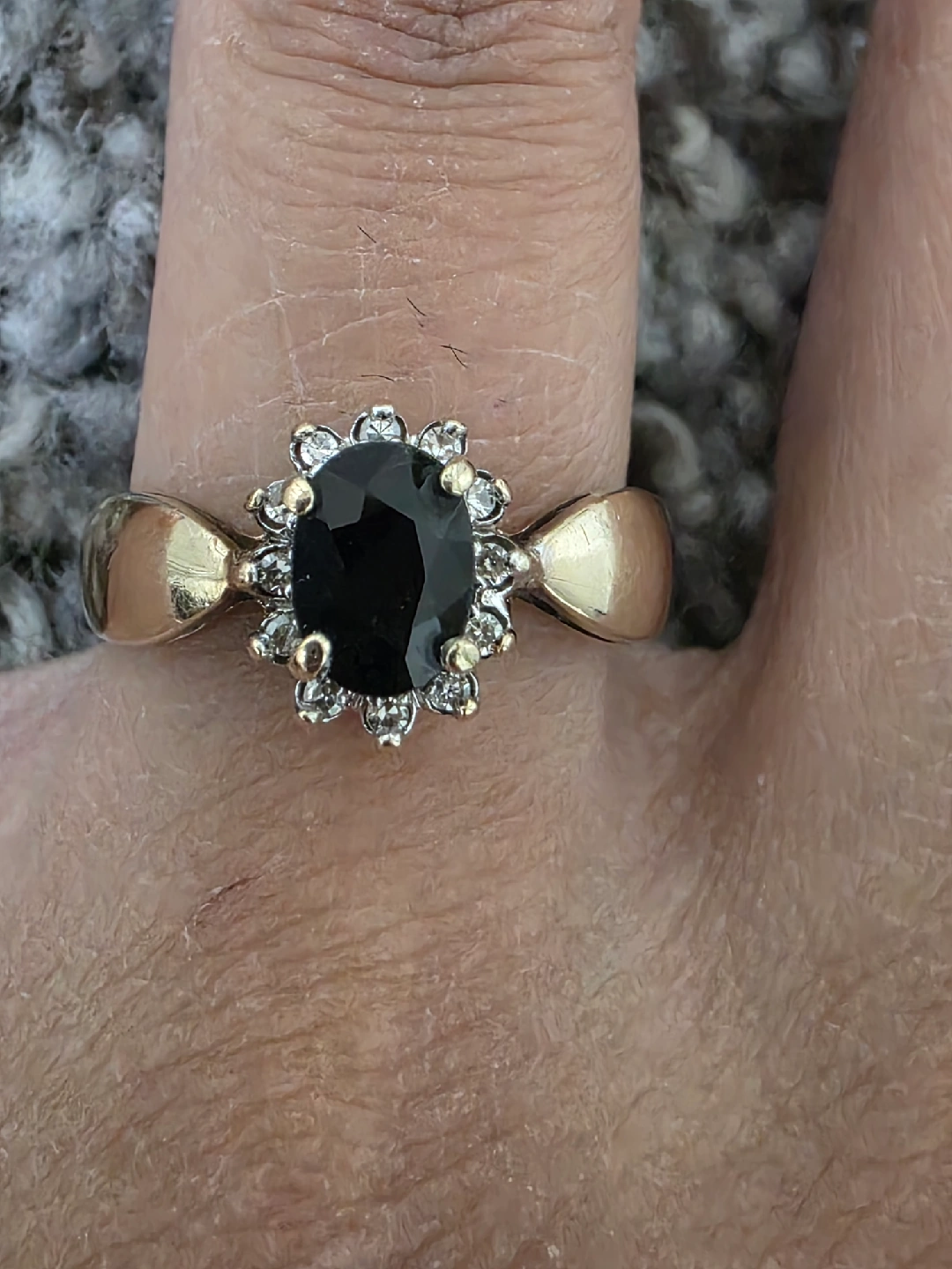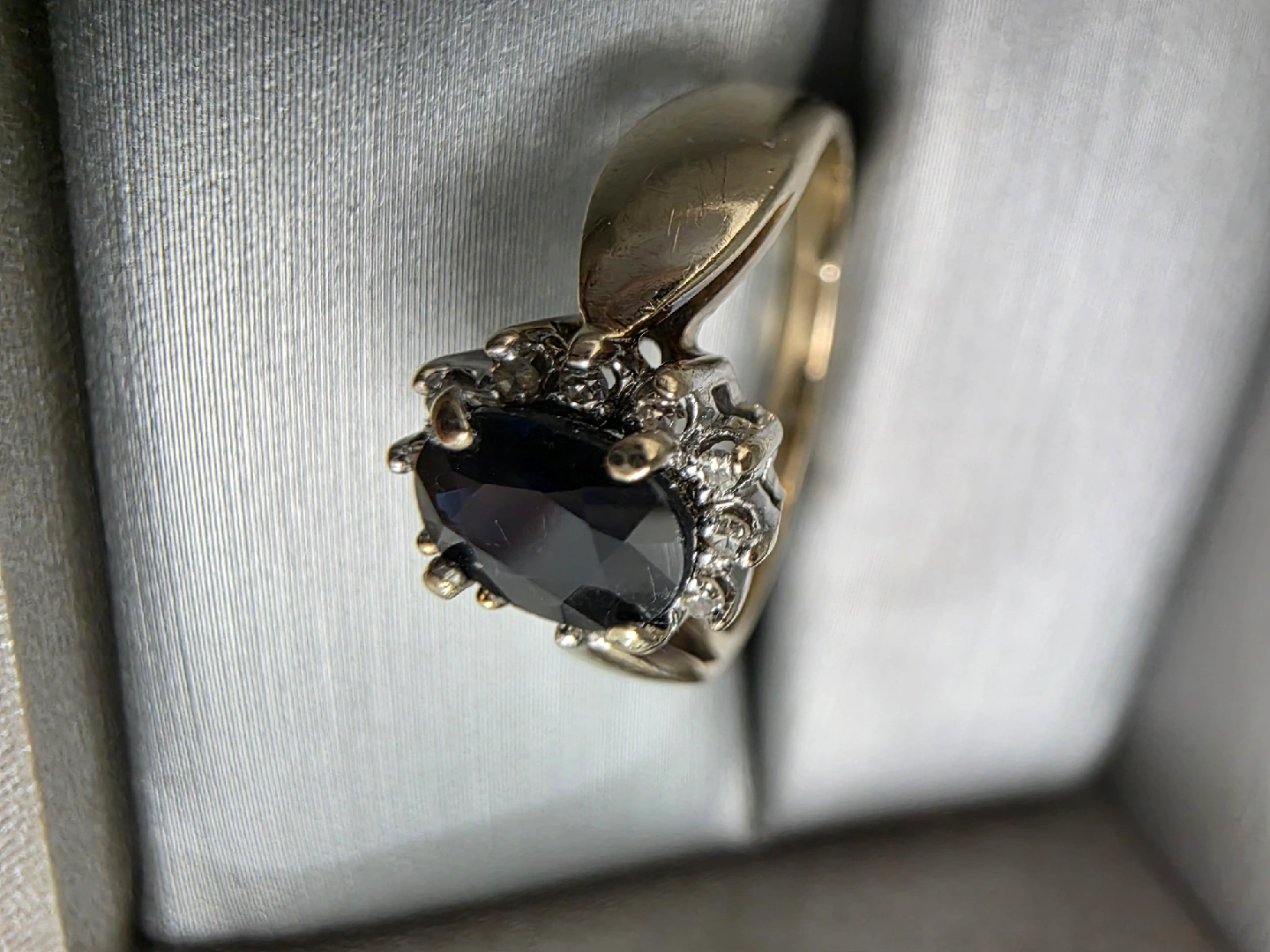 Selling a lovely vintage ring featuring a dark blue sapphire surrounded by small diamonds. It's a beautiful piece that would make a great addition to any jewelry collection 10k yellow gold