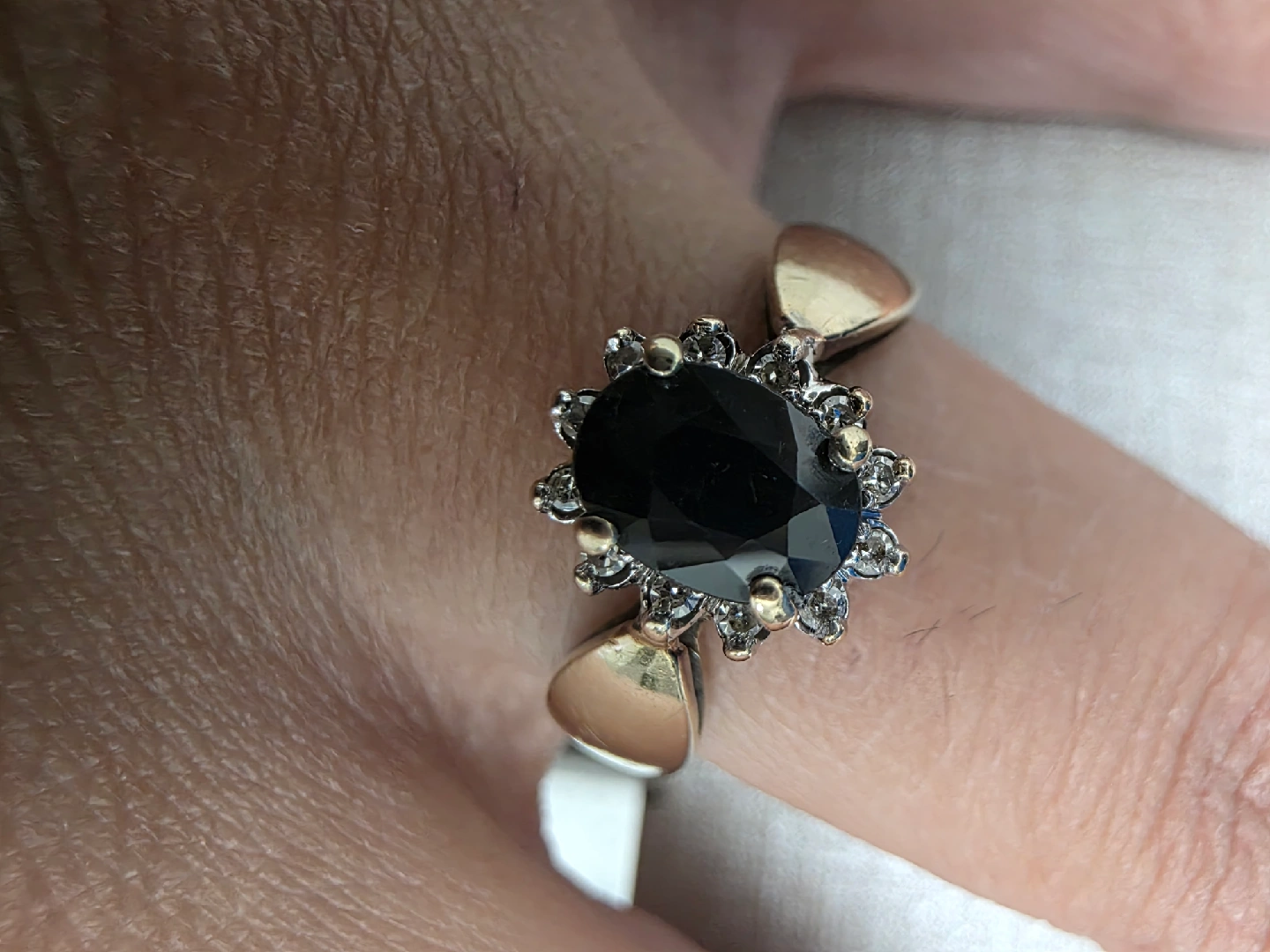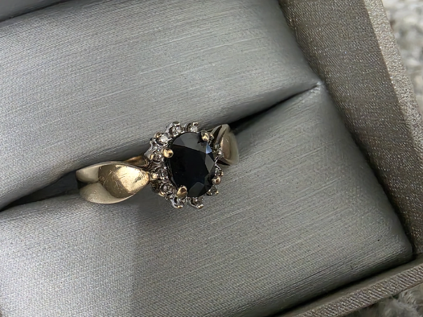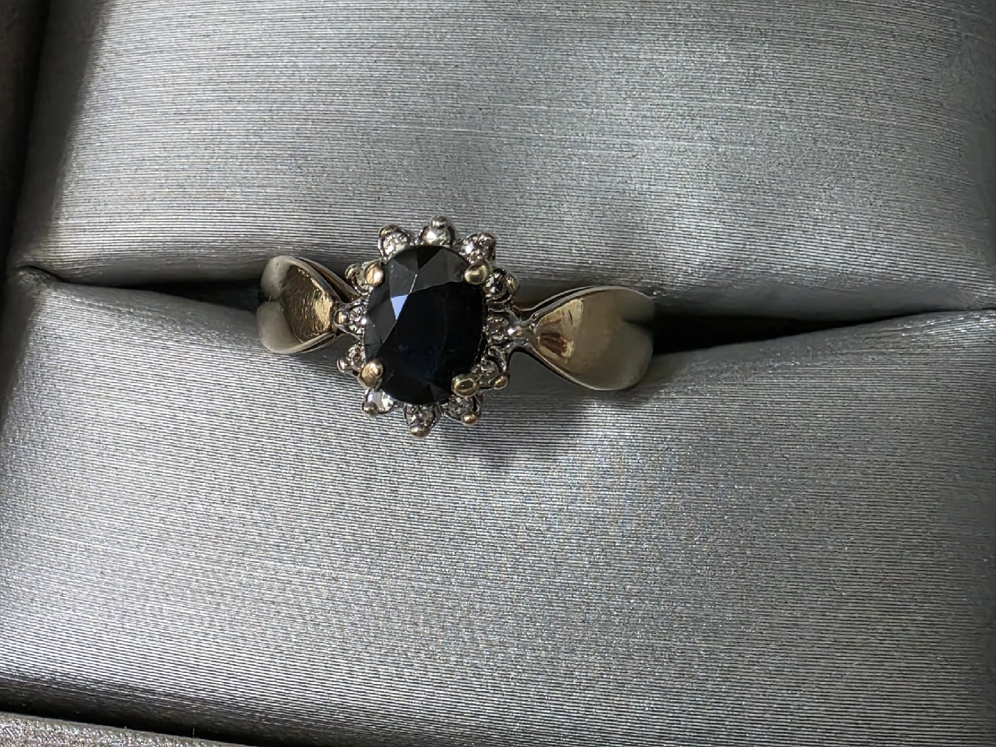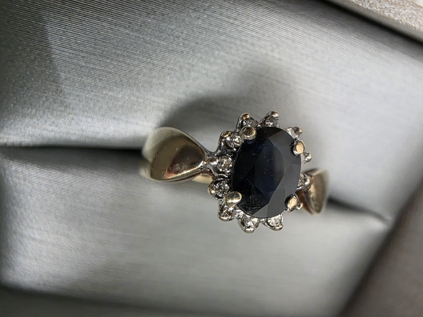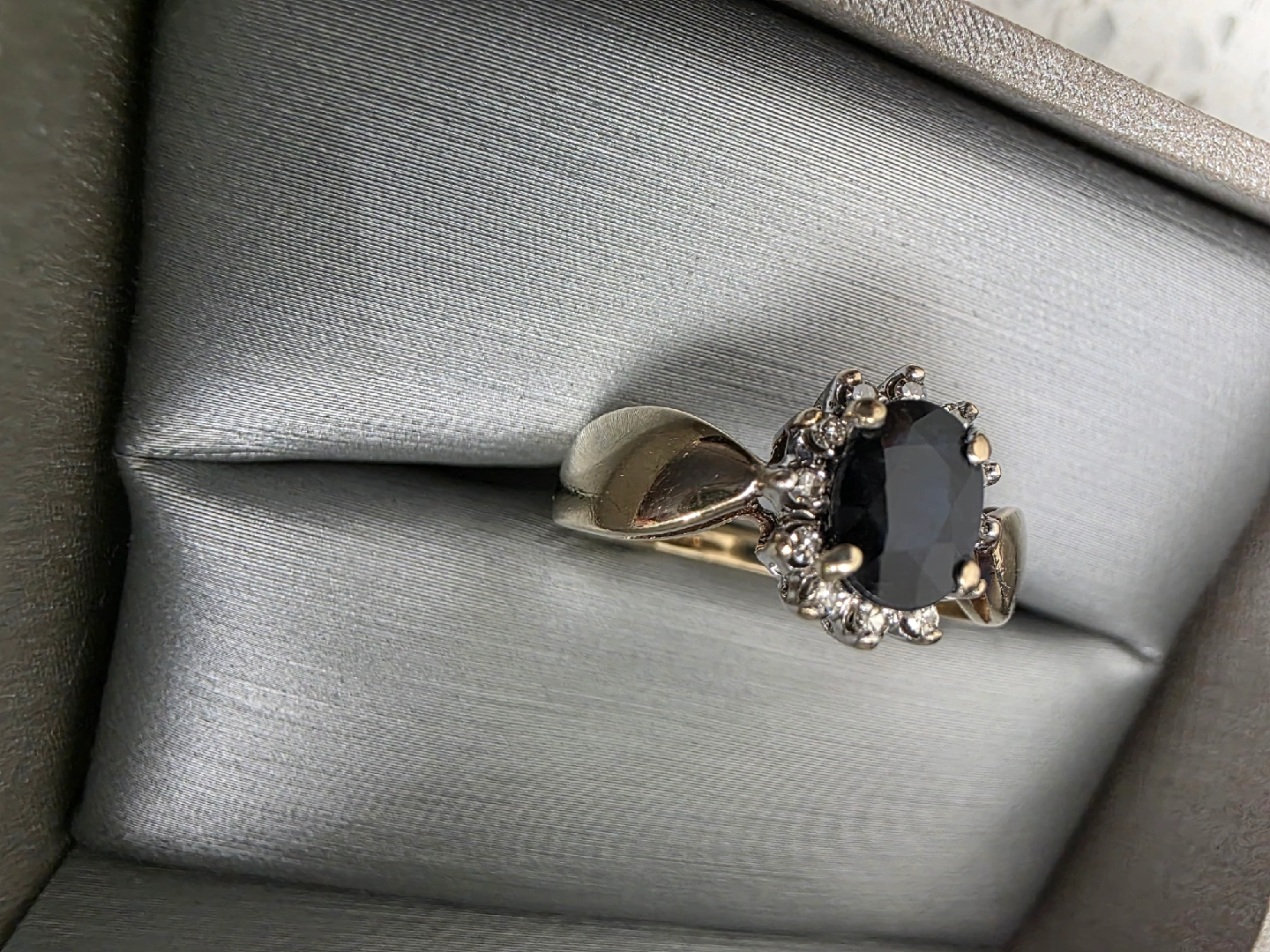 Selling a lovely vintage ring featuring a dark blue sapphire surrounded by small diamonds. It's a beautiful piece that would make a great addition to any jewelry collection 10k yellow gold