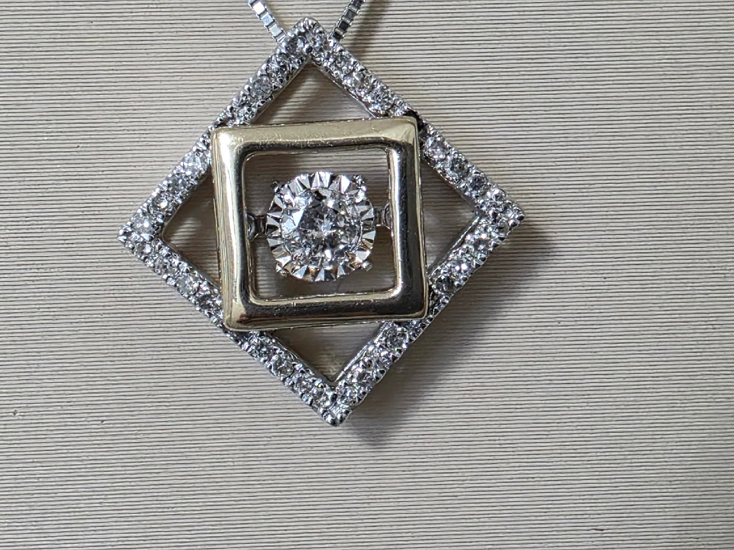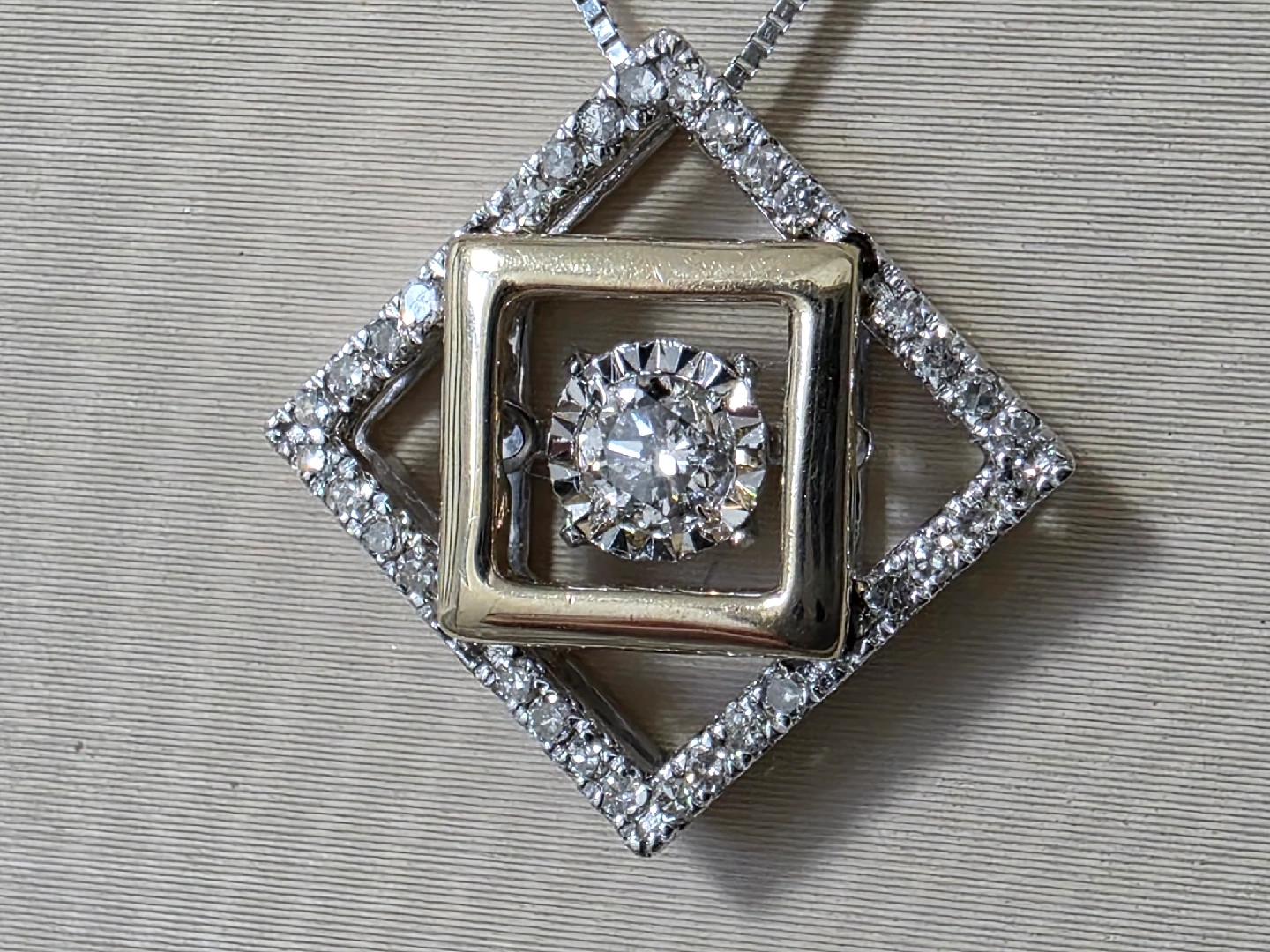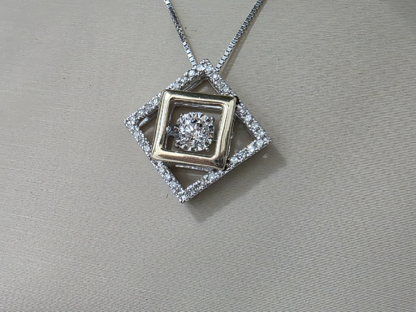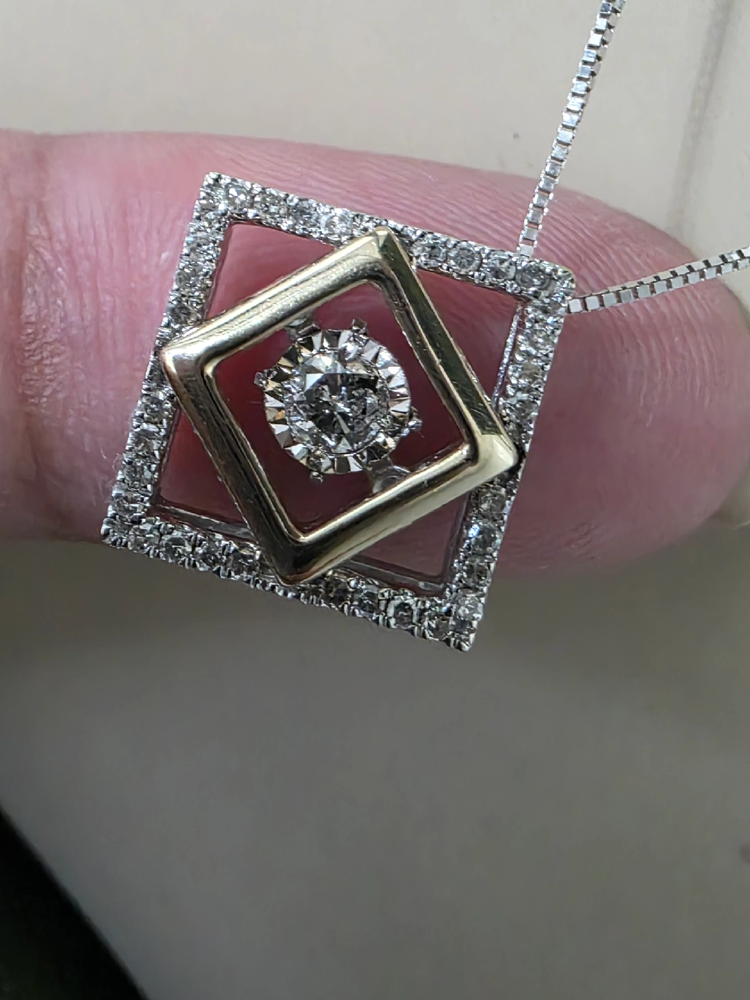 Beautiful diamond pendant necklace featuring a square design with a centre diamond. The pendant is crafted in 10K gold and is in great condition! It has the letters MHJ on the back. 0.50tdw