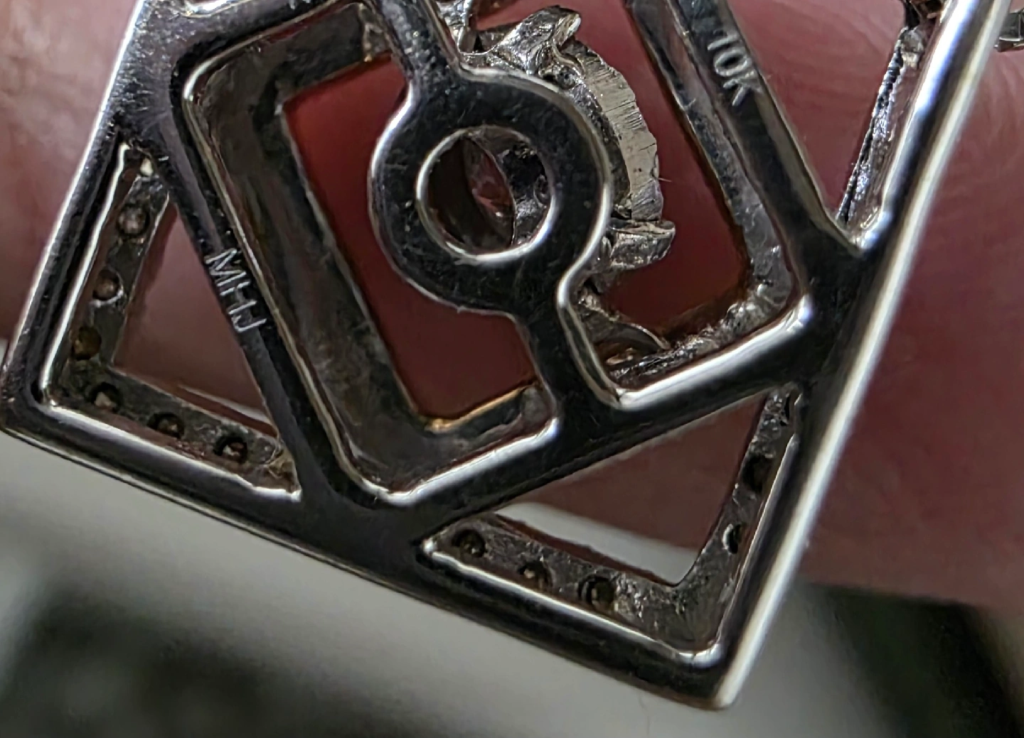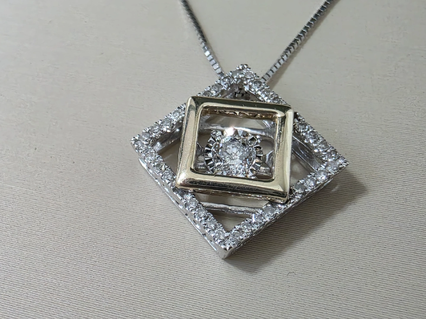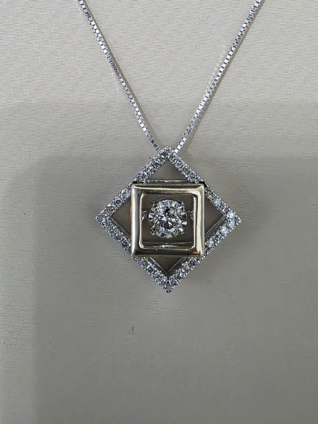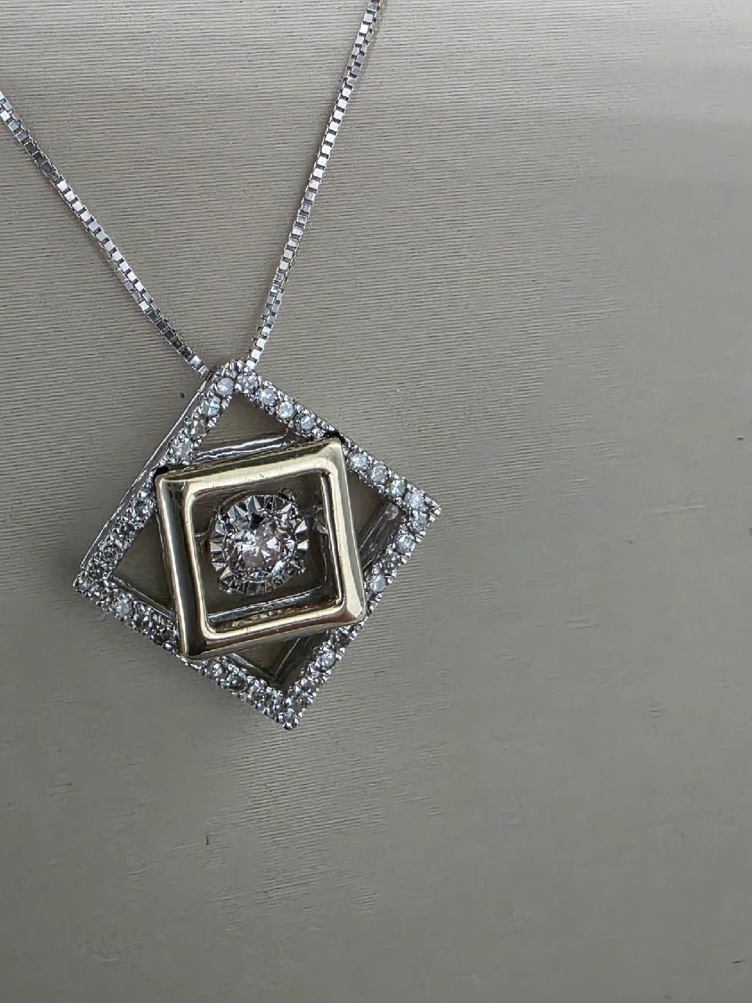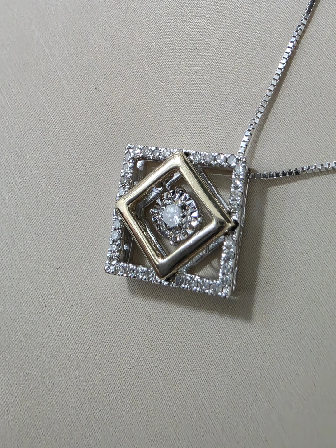 Beautiful diamond pendant necklace featuring a square design with a centre diamond. The pendant is crafted in 10K gold and is in great condition! It has the letters MHJ on the back. 0.50tdw