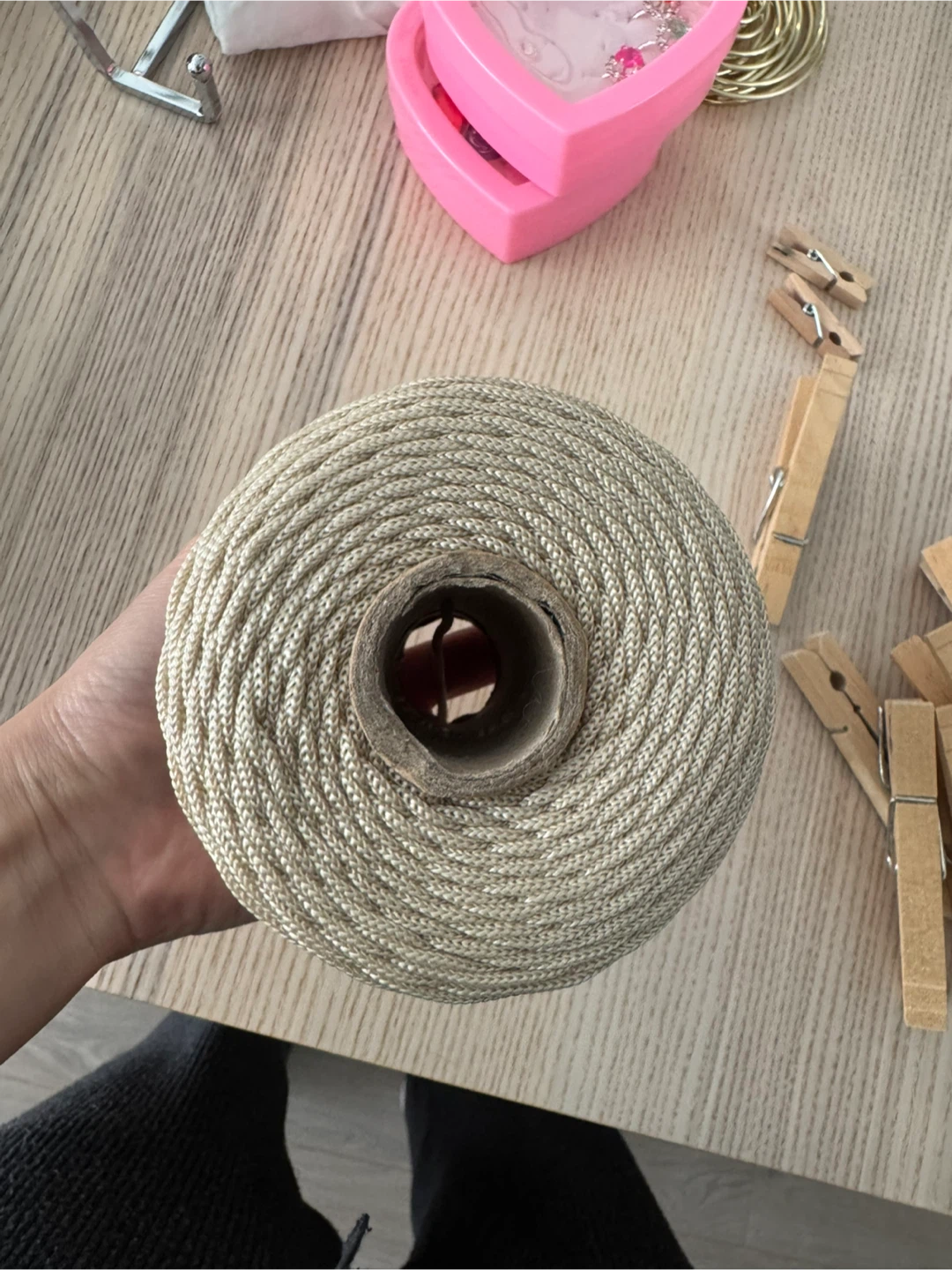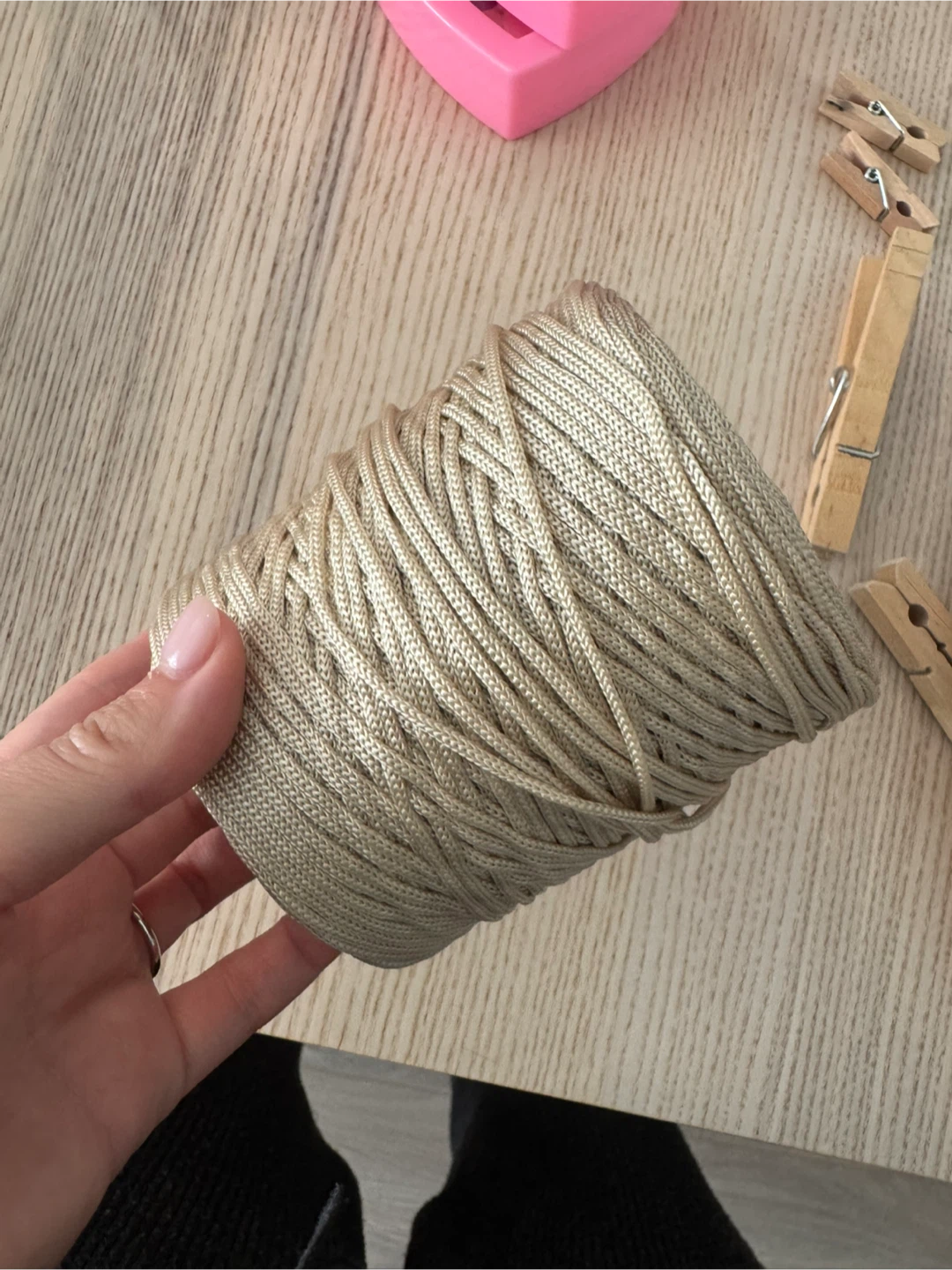 Selling a roll of gold-colored macrame cord. It's perfect for all sorts of crafting projects! The material feels nice and sturdy, ready for your next DIY adventure