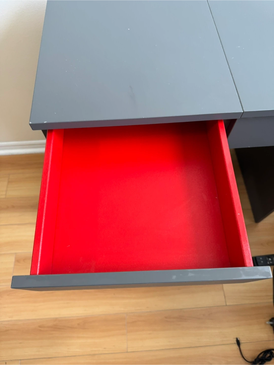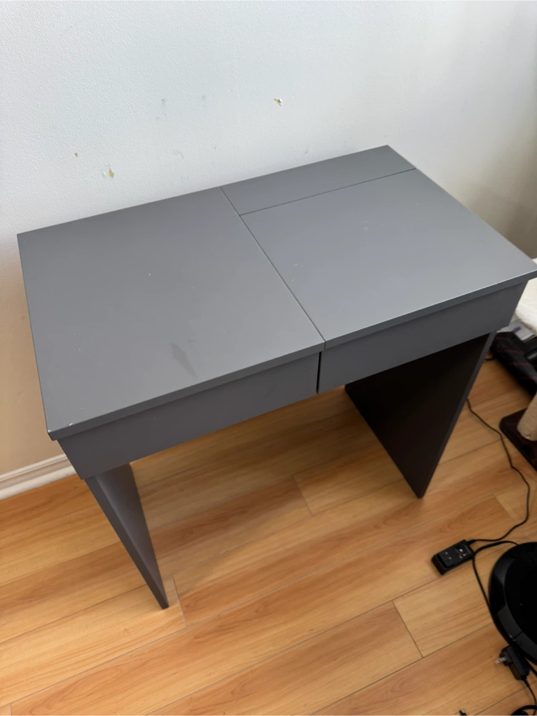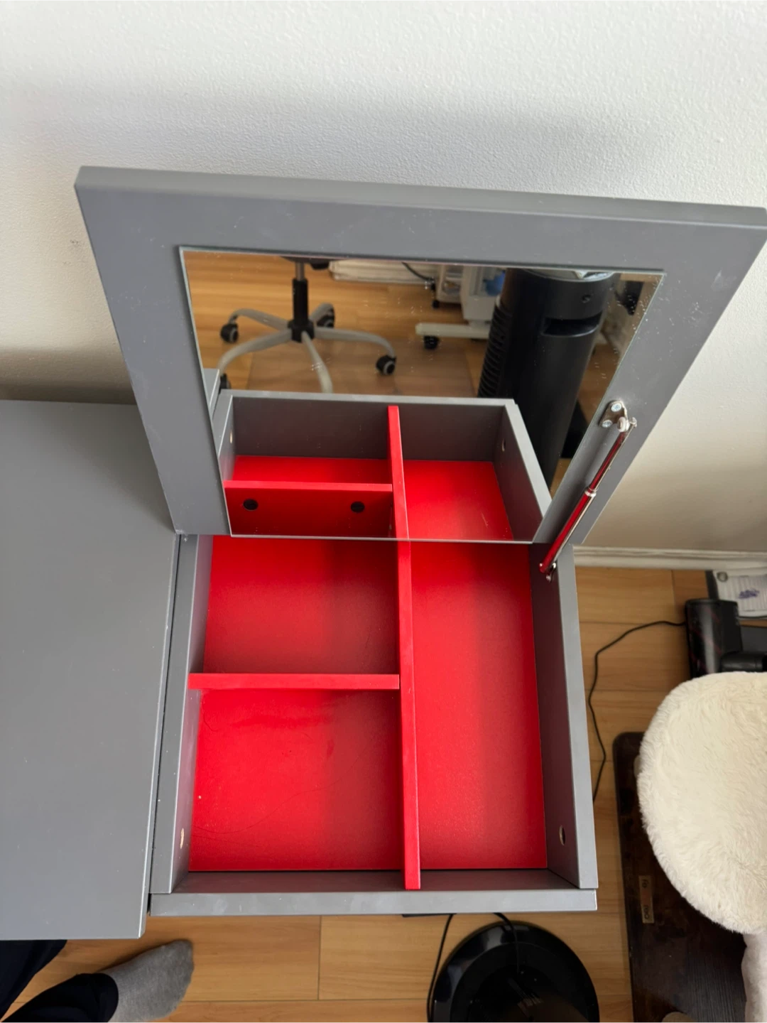 Selling a grey vanity desk that's in great shape! It features a flip-up mirror and a red interior. Perfect for getting ready in the morning or as a small workspace. Message me if you're interested!