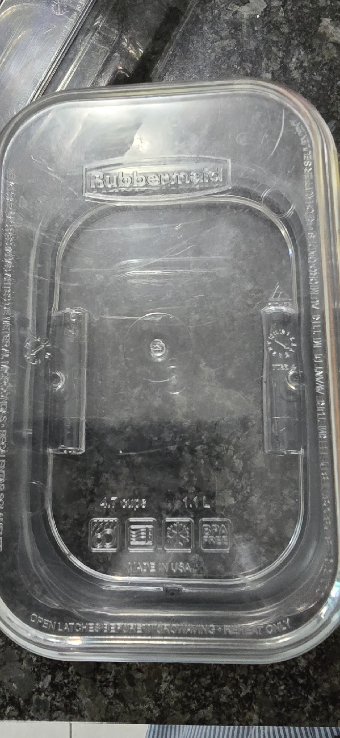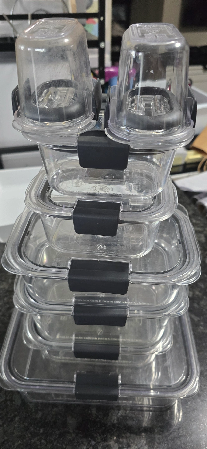 Selling a Rubbermaid Brilliance food storage container set (9 pieces). These containers are clear and come with black latches. The set includes various sizes, perfect for storing leftovers or meal prepping! They are BPA free and made in the USA