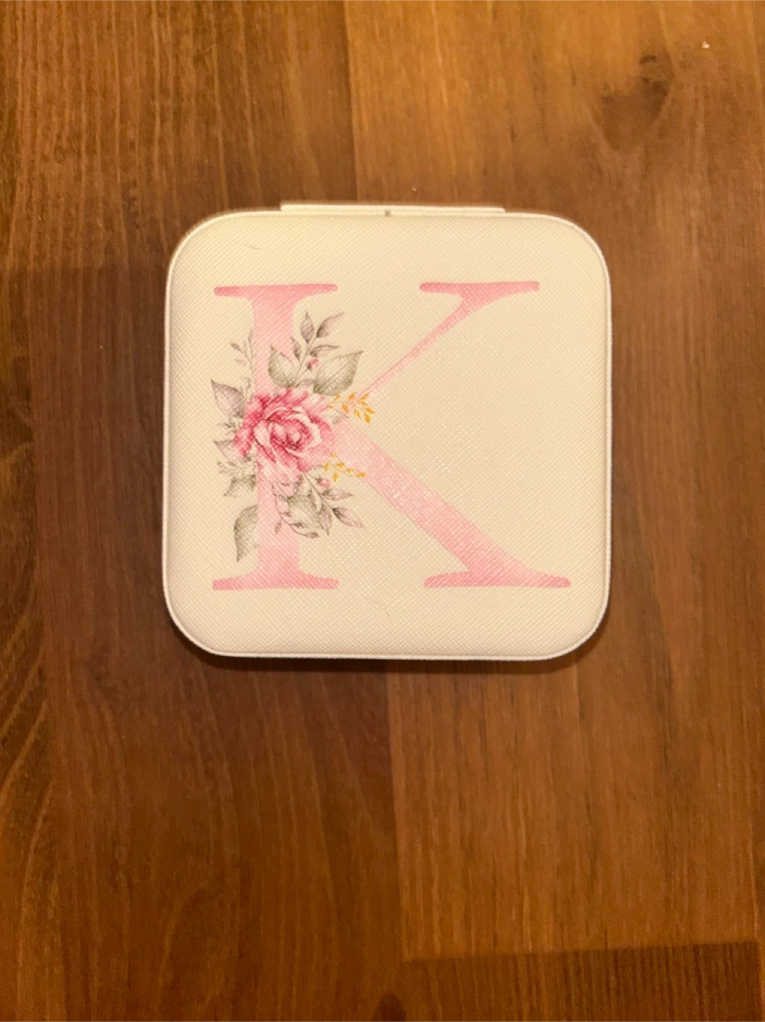 Selling a cute personalized travel jewelry box with the letter K on it! It's perfect for keeping your jewelry organized while you're on the go. The inside has compartments for rings, necklaces, and other small items. It's in great condition and ready for a new home