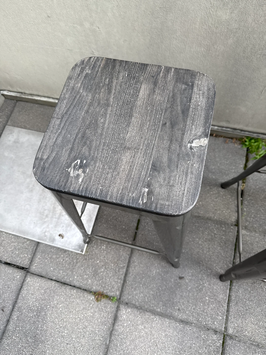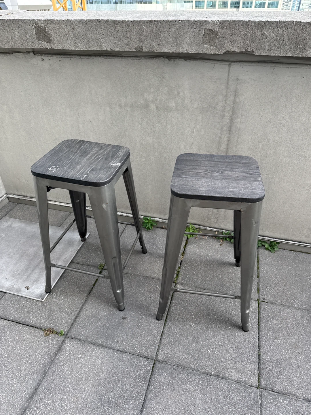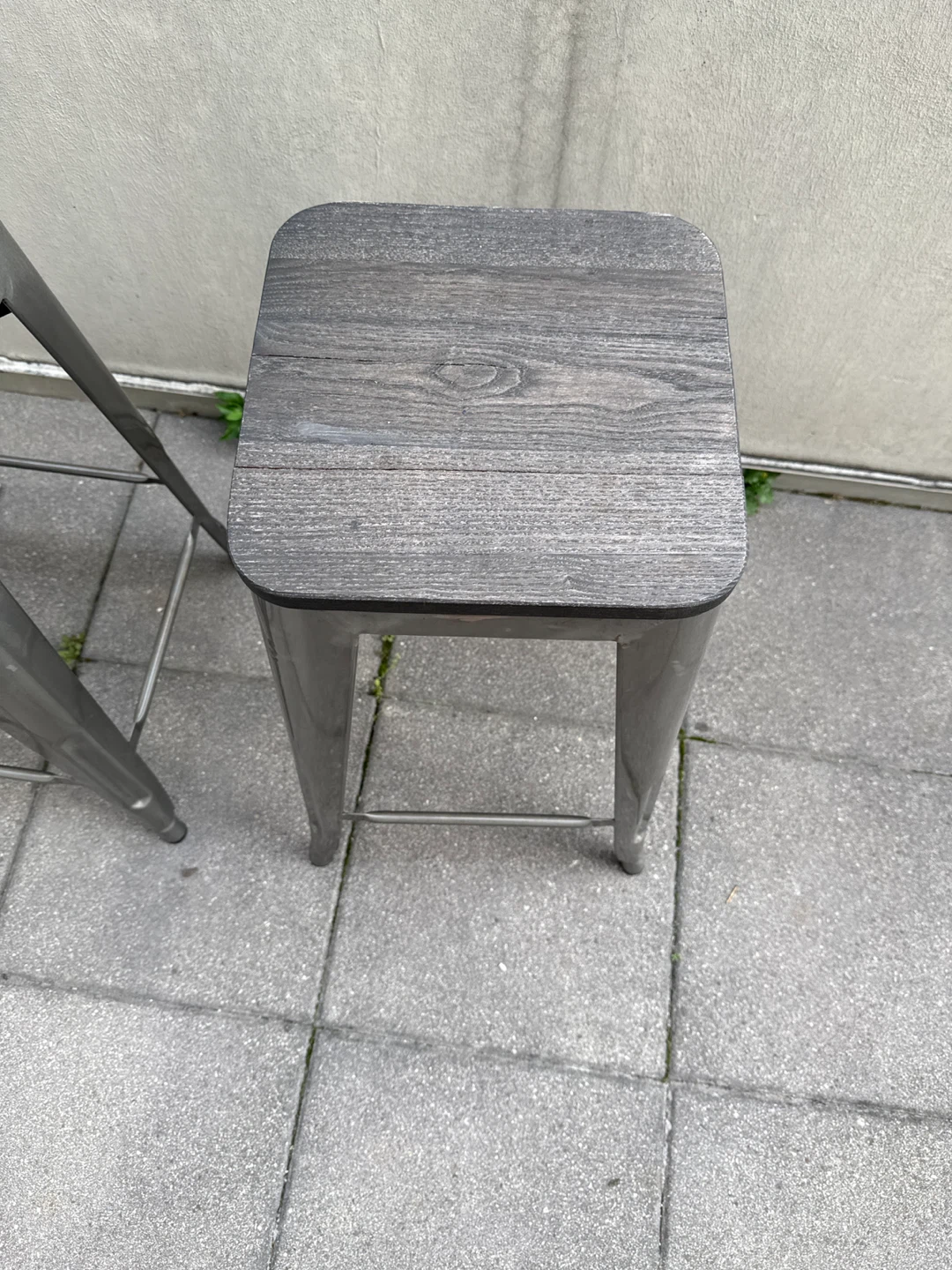 Selling a set of two bar stools. They have a grey metal frame with a wooden seat. They're in good condition and would look great in any kitchen or bar area!