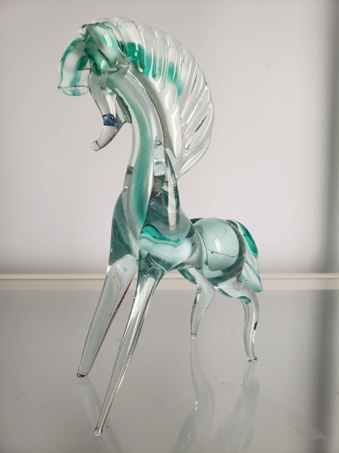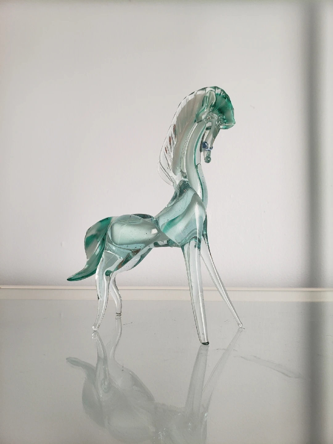 Selling a beautiful glass horse figurine. It's in mint condition and would make a lovely addition to any home. The glass is clear with swirls of green throughout, giving it a unique and elegant look