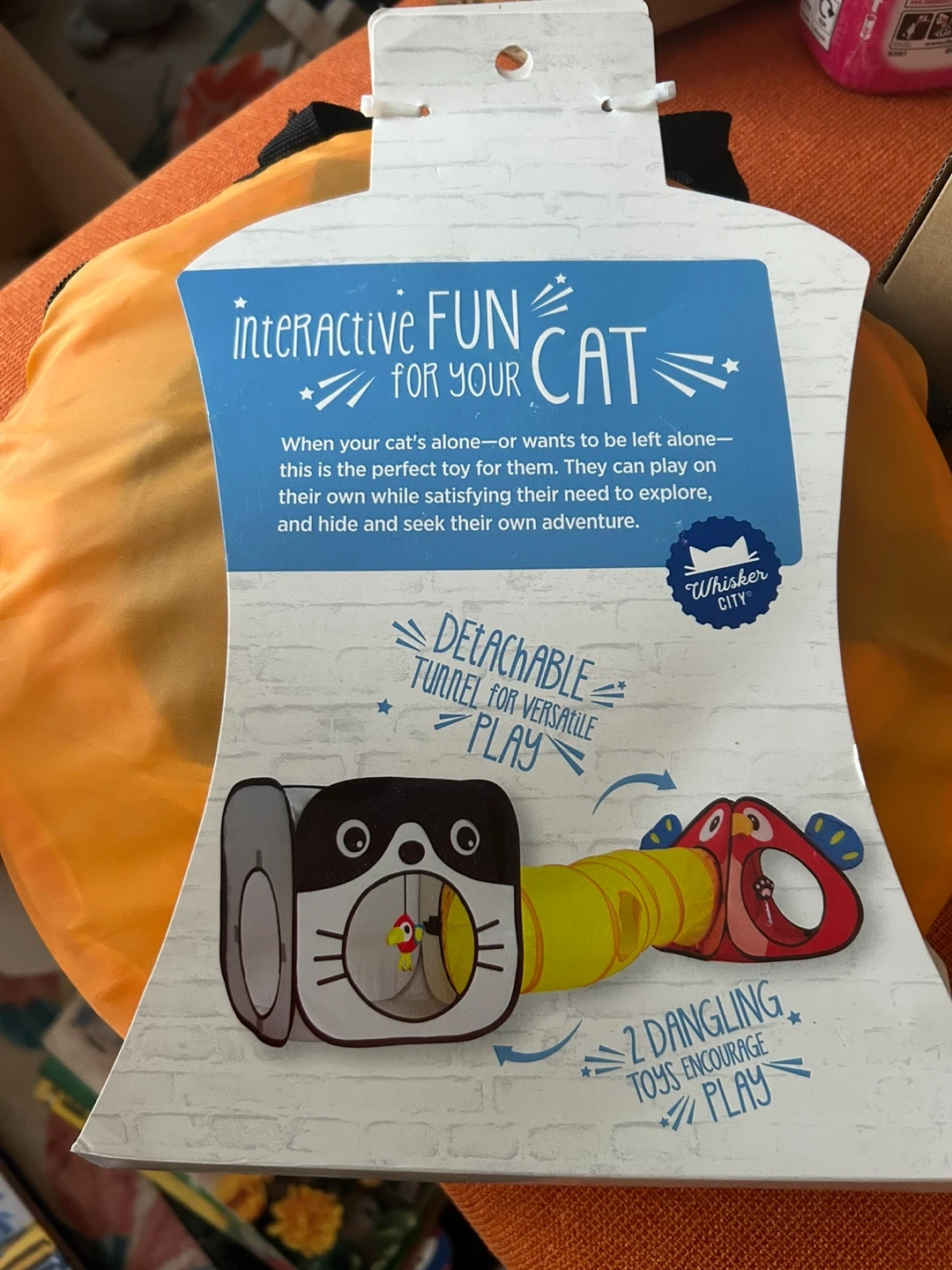Set of two houses, with a yellow connecting tunnel. The three items can be connected using velcro, or kept seperate. Two dangling toys with a bell on the houses!