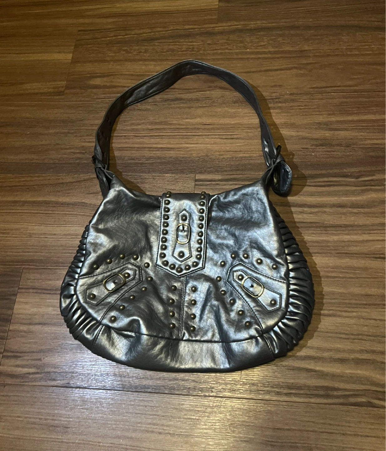 Selling a stylish silver metallic shoulder bag. It's in great condition and perfect for adding a bit of shine to your outfit! It has a unique design with decorative studs and a comfortable shoulder strap