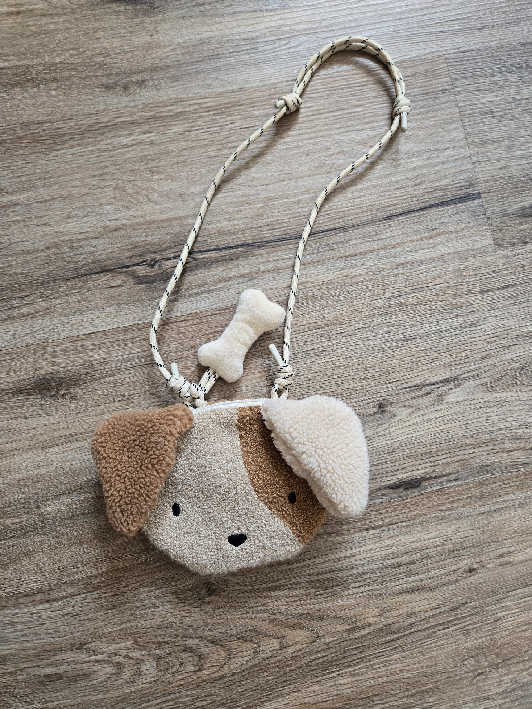 Super cute crossbody bag for kids! It's designed like a dog's face with fluffy ears and comes with a bone-shaped accessory. Perfect for little ones to carry their treasures