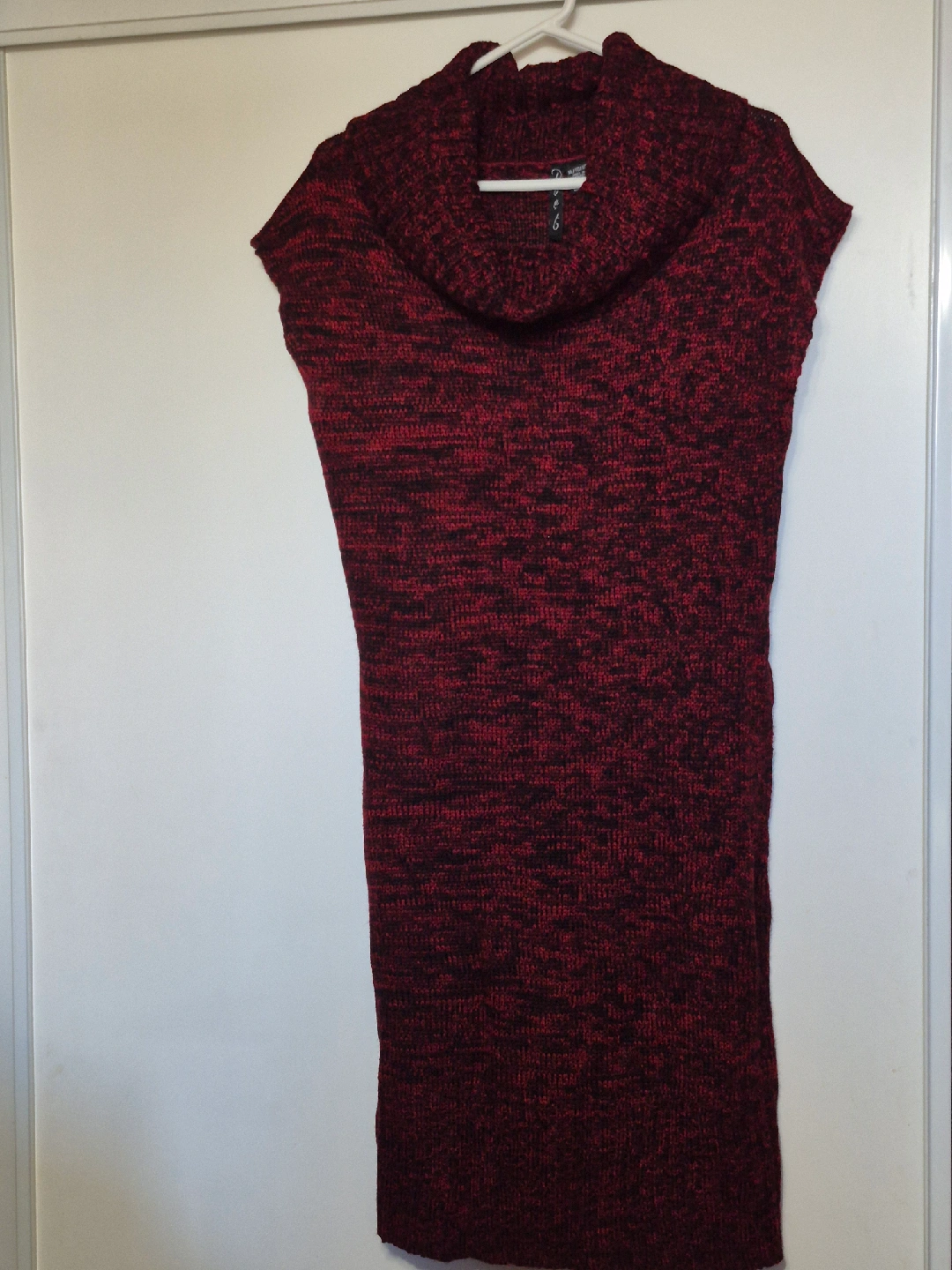 Selling a Dress Barn knit dress in a lovely red and black colour. It features a cozy cowl neck and is a size XL. Perfect for cooler weather!