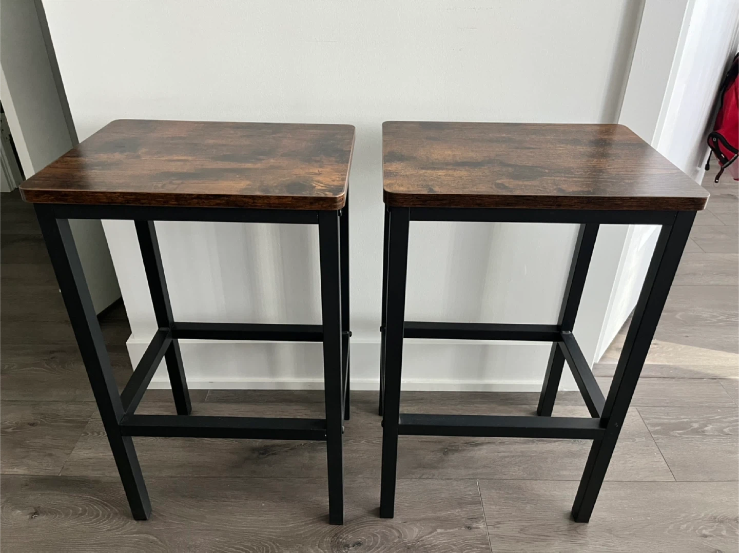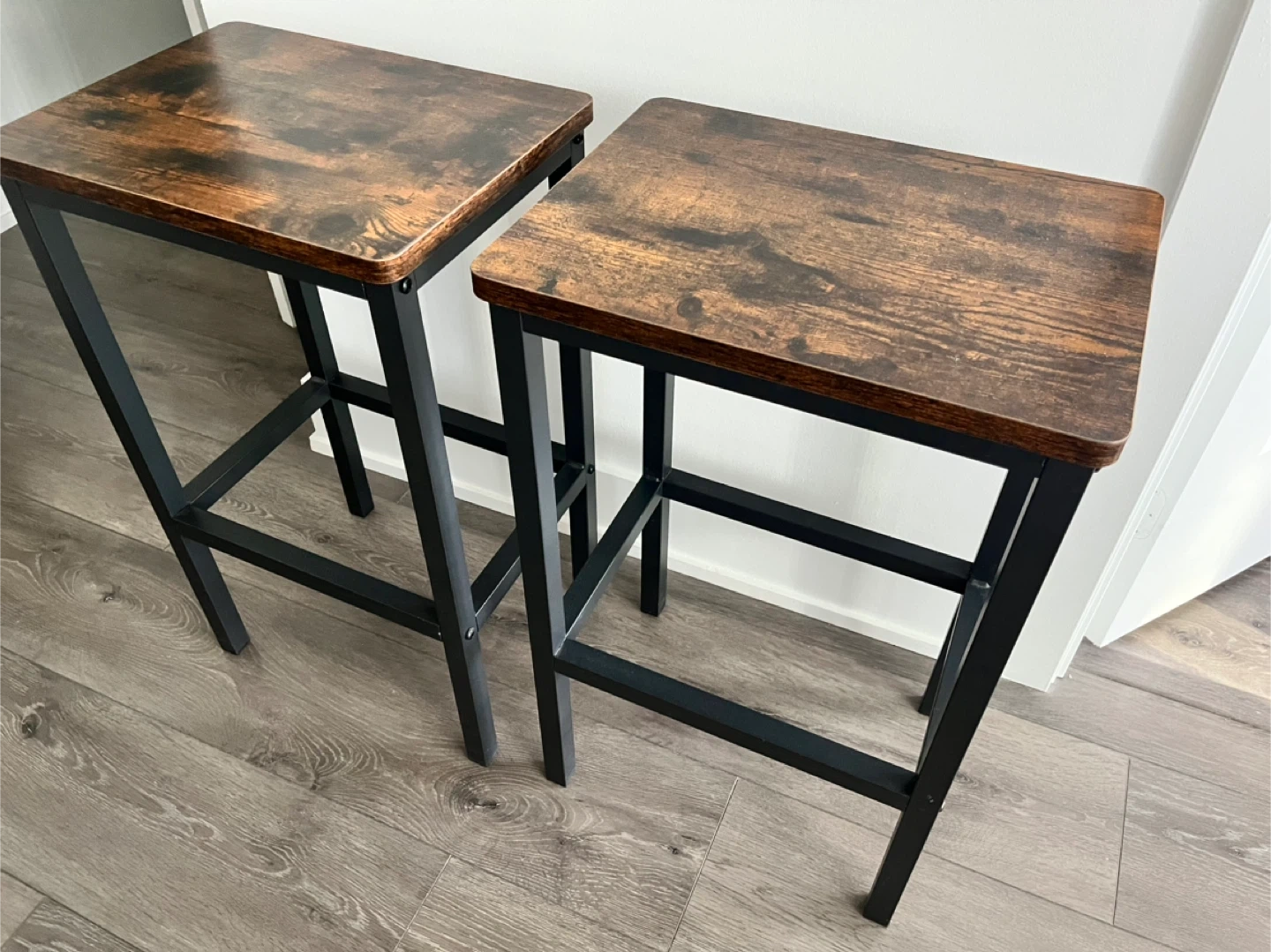 Selling a set of two bar stools! They feature a rustic brown wood-look top and a sturdy black metal frame. Perfect for adding a touch of industrial style to your kitchen or bar area. They are in great condition and ready for a new home