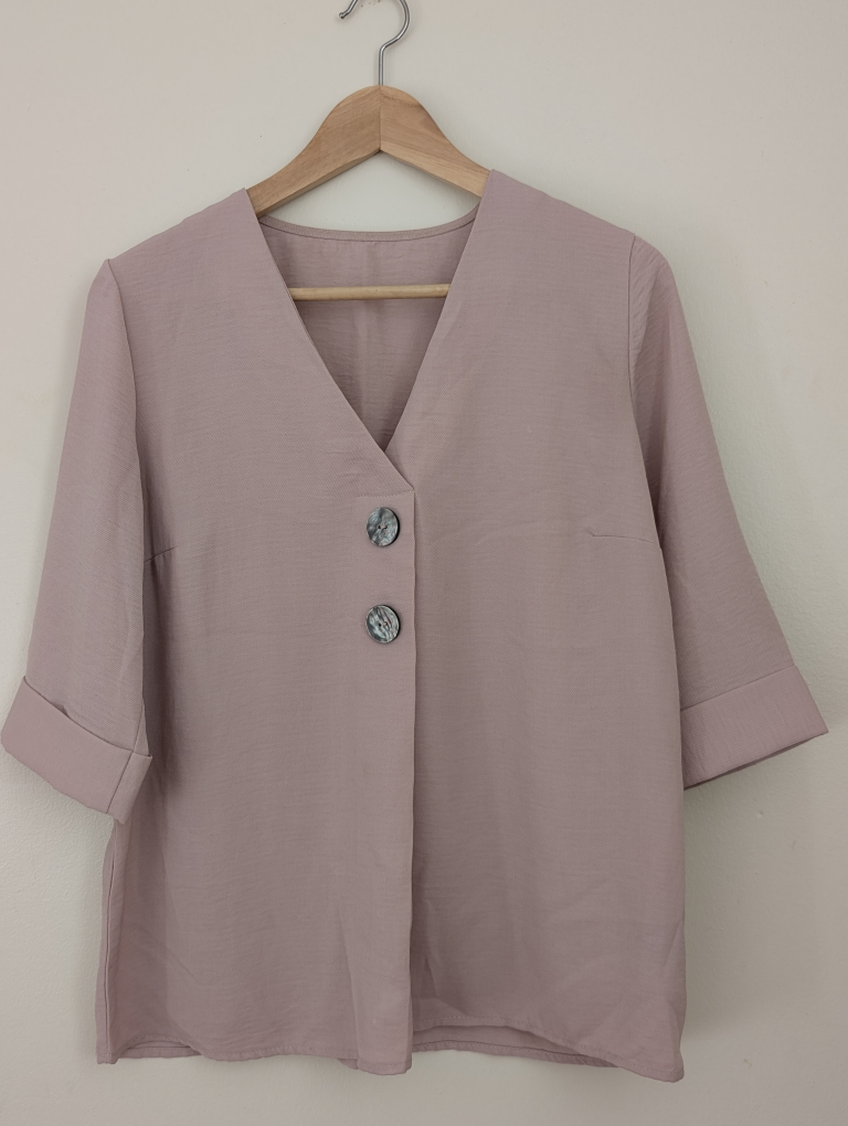 Here's a lovely light pink blouse with a V-neck and button-down style! It features a unique button design and cuffed sleeves. It's in great condition and ready for a new home!
