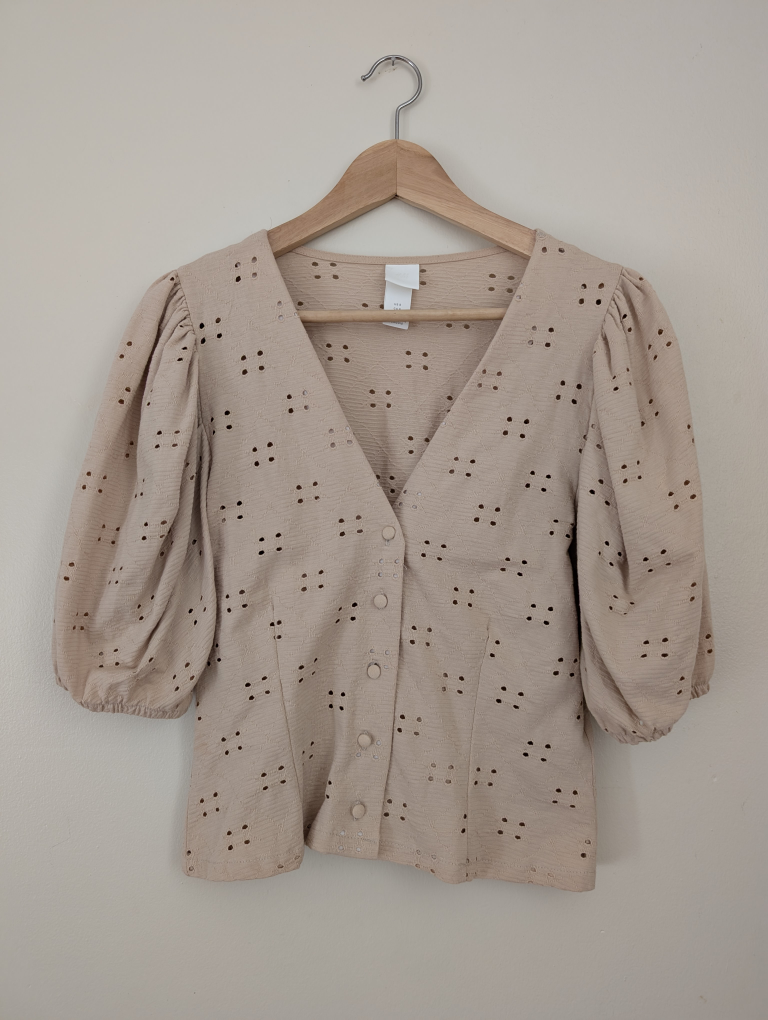 Selling a cute H&M beige eyelet blouse in size small! It's in great condition and has a lovely textured pattern. Perfect for a light and breezy look!