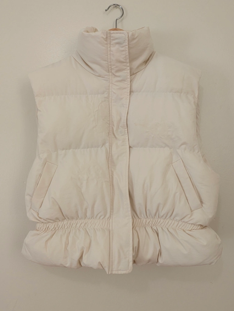 A stylish cream-coloured puffer vest, perfect for layering! It's a size small and in great condition. This vest is lightweight and comfortable, making it ideal for those in-between weather days. It features a high collar and elasticated waist for a flattering fit.