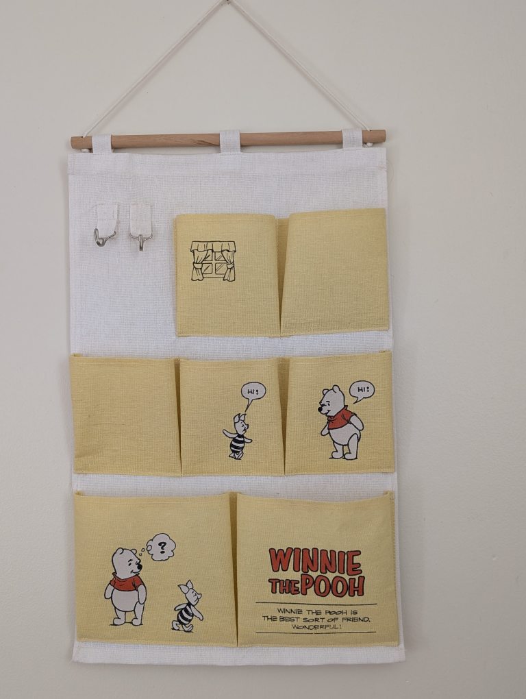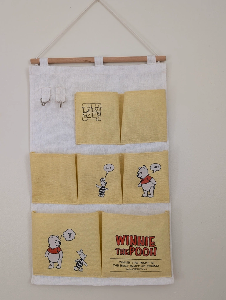 This Winnie the Pooh wall organizer is perfect for adding a touch of whimsy to any room! It features several pockets to help keep things tidy and organized. The design includes classic Winnie the Pooh characters and quotes. It's a wonderful and practical piece!