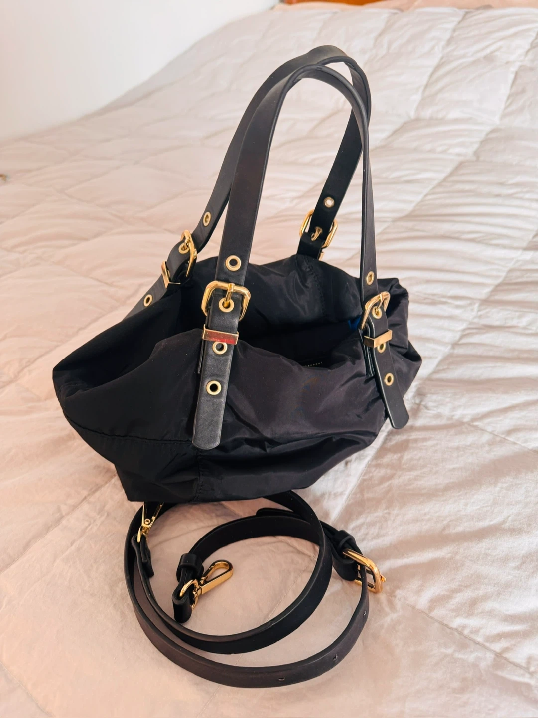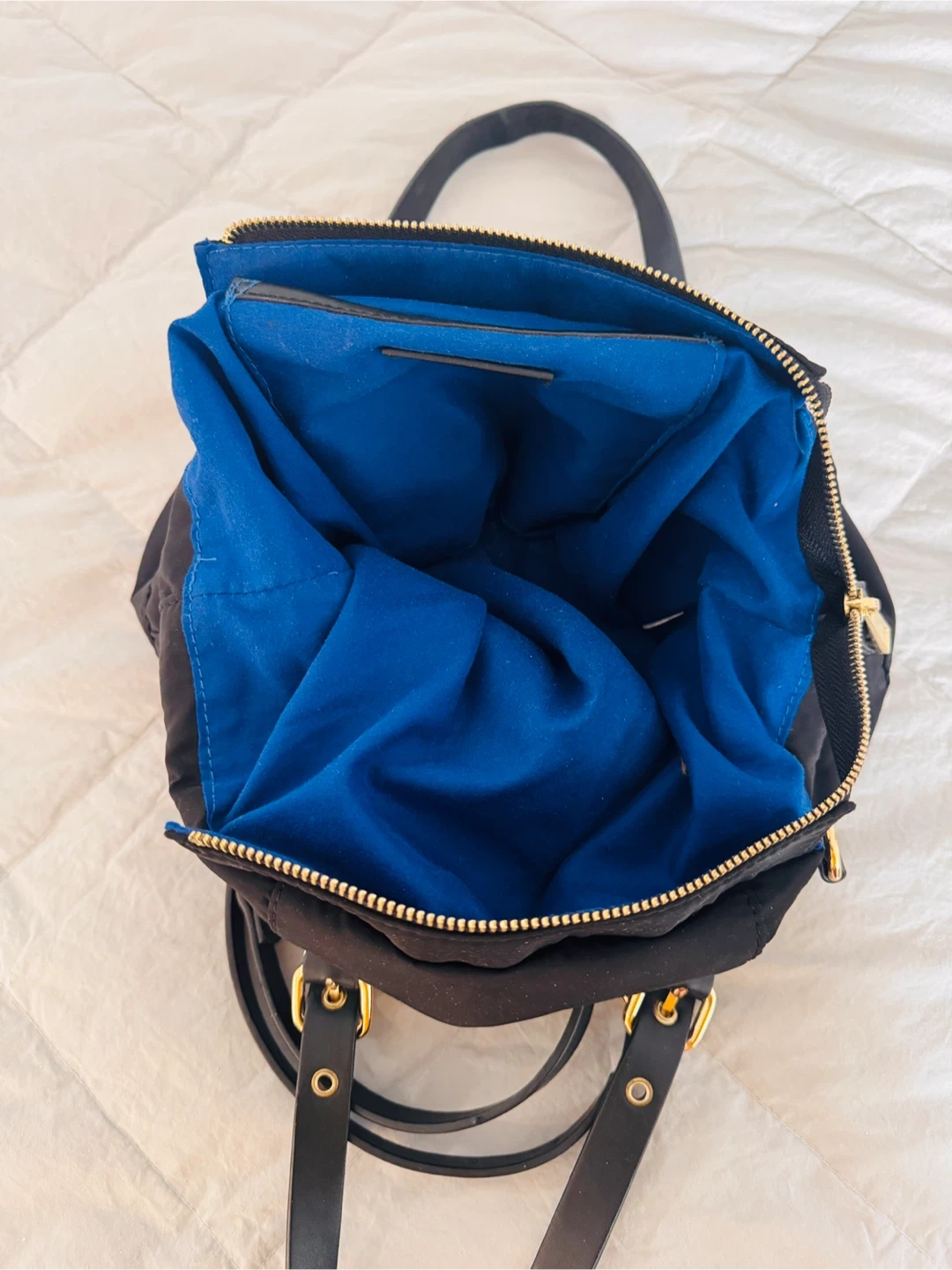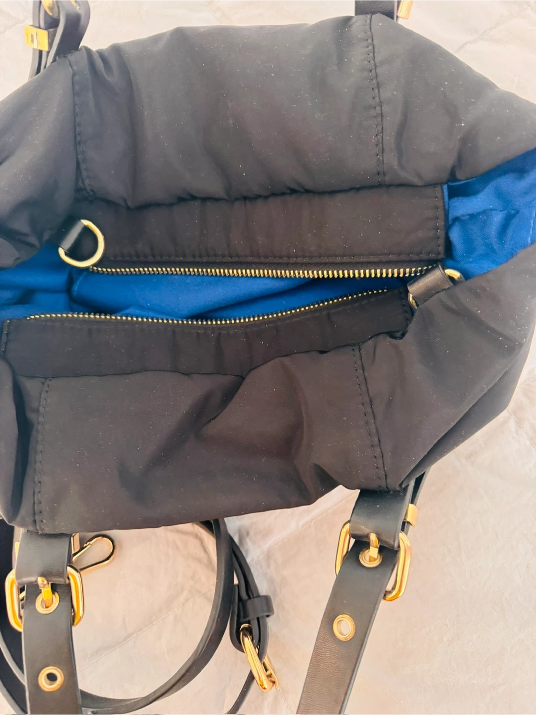 Selling a stylish handbag ! It features a sleek black nylon exterior with elegant leather trim and gold-tone hardware. The interior is lined with a vibrant blue fabric, adding a pop of colour. Perfect for everyday use!