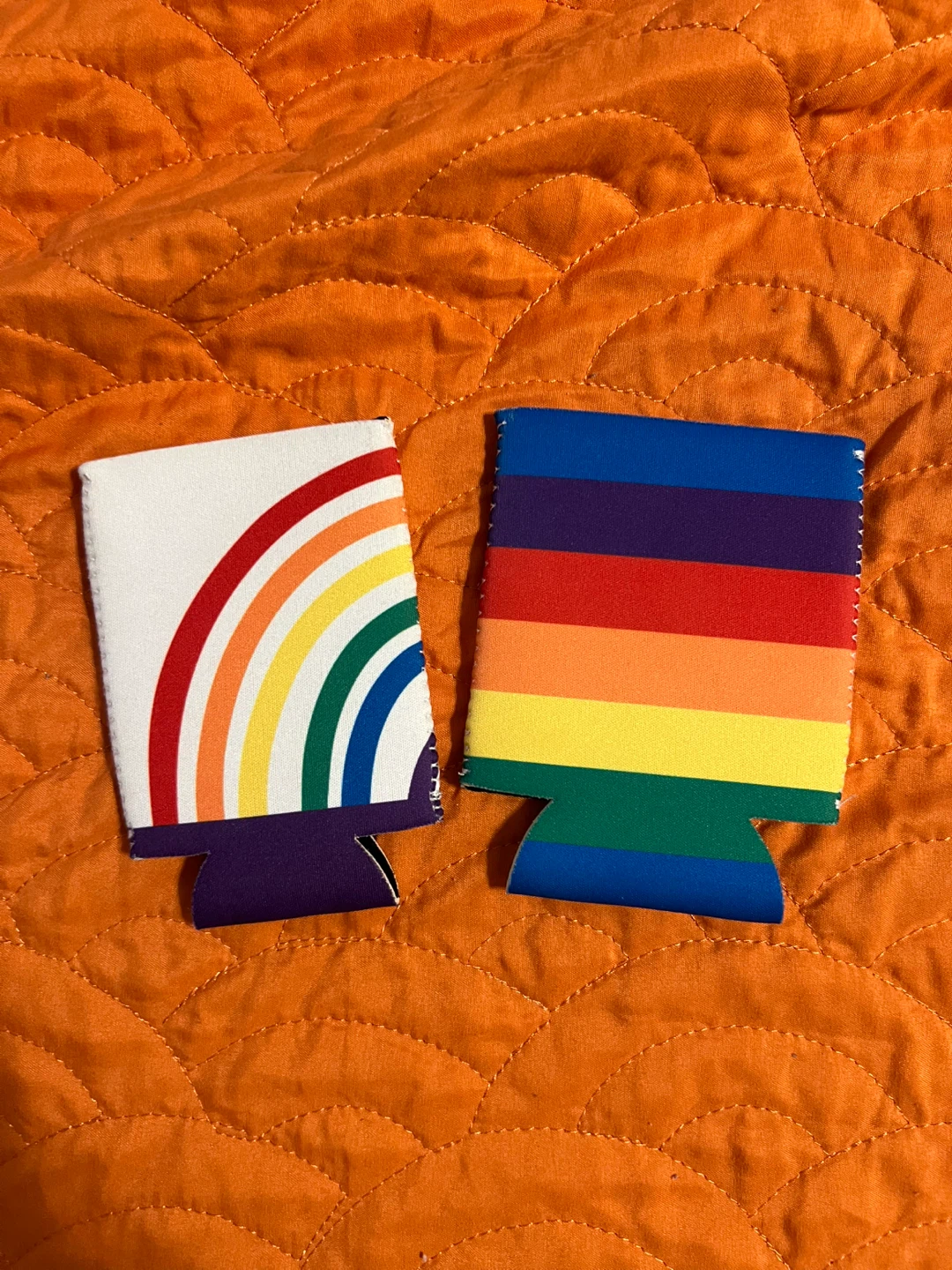 Selling a set of two fun rainbow can coolers! One has a rainbow arch design on a white background, and the other features horizontal rainbow stripes. Perfect for keeping your drinks cold and adding a pop of color and pride!