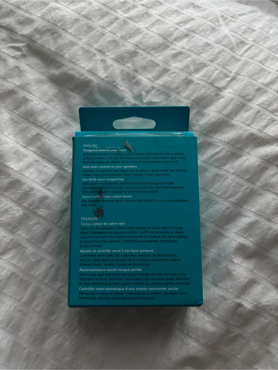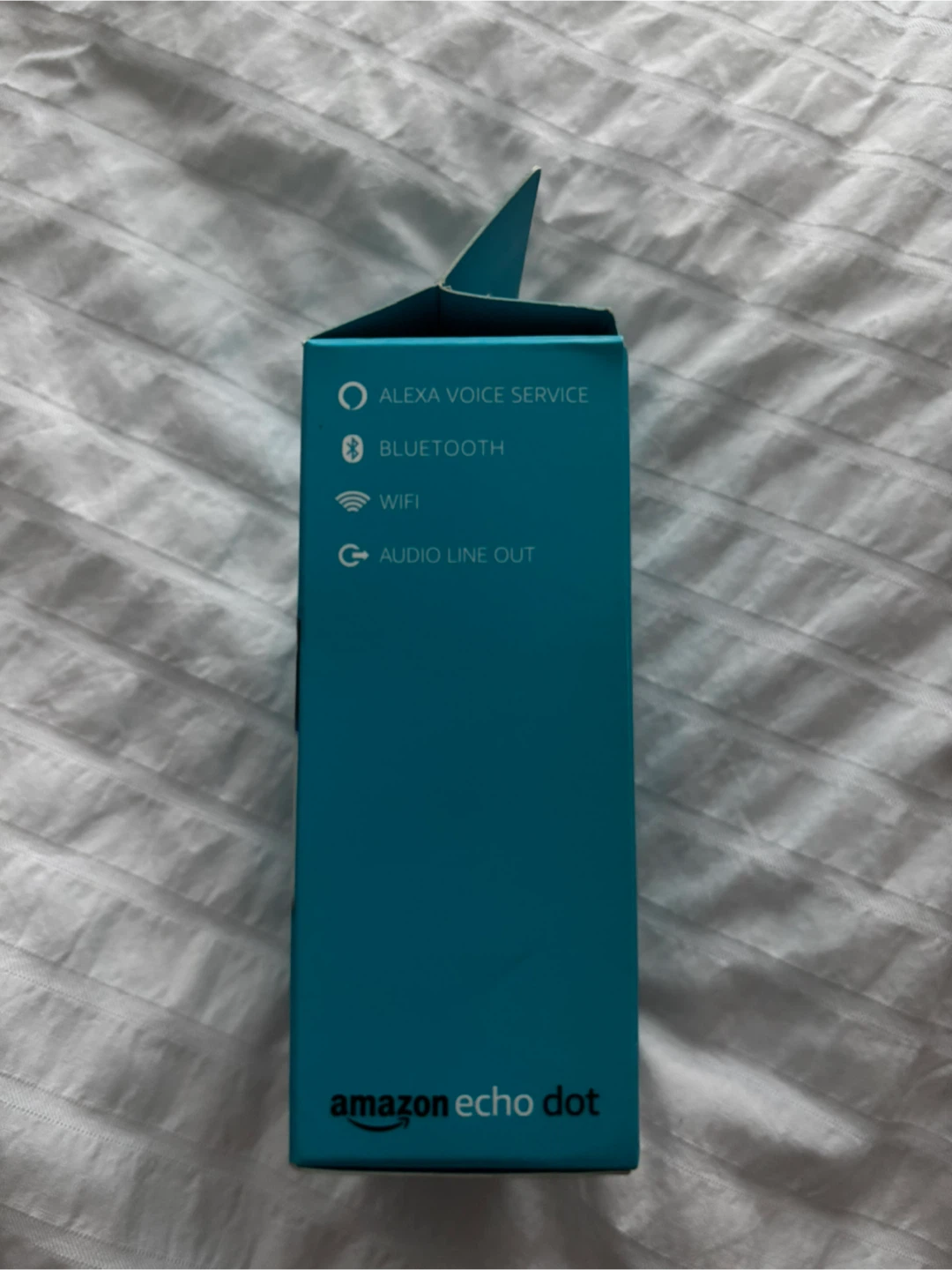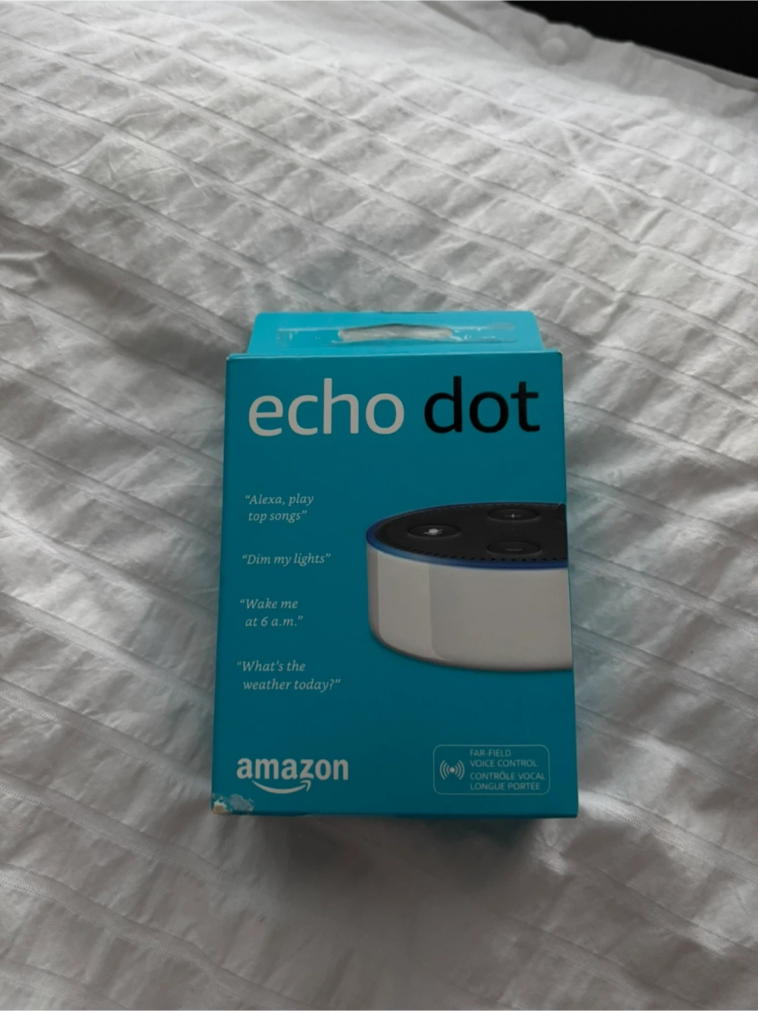 It can connect to speakers over Bluetooth or with an audio cable, and directly stream from Amazon Music, Spotify, TuneIn, and more. The box is included and it comes with the Amazon Echo Dot (2nd generation), a power adaptor (9W), and a Micro-USB cable