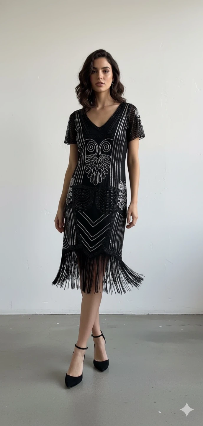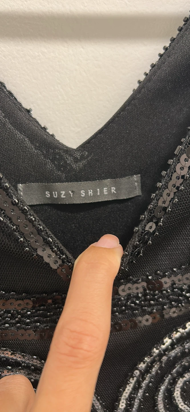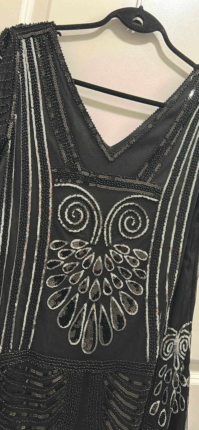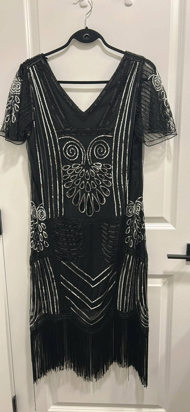 Selling a beautiful Suzy Shier flapper dress in size L! It's a stunning piece with intricate beadwork and a classic 1920s-inspired design. Perfect for a special occasion or a vintage-themed party