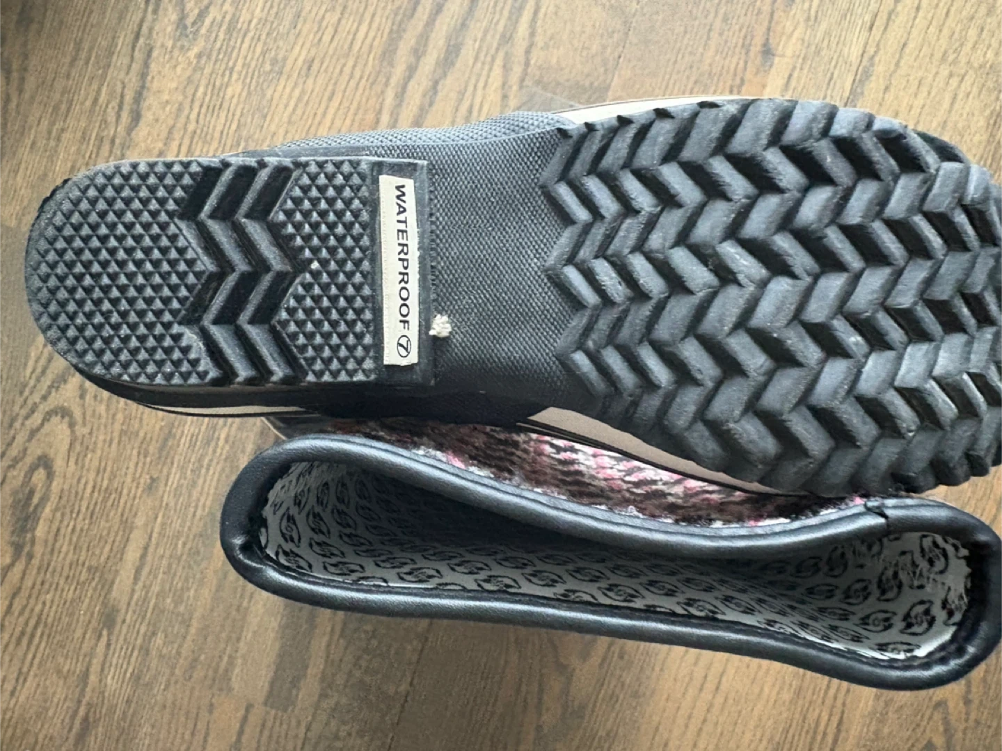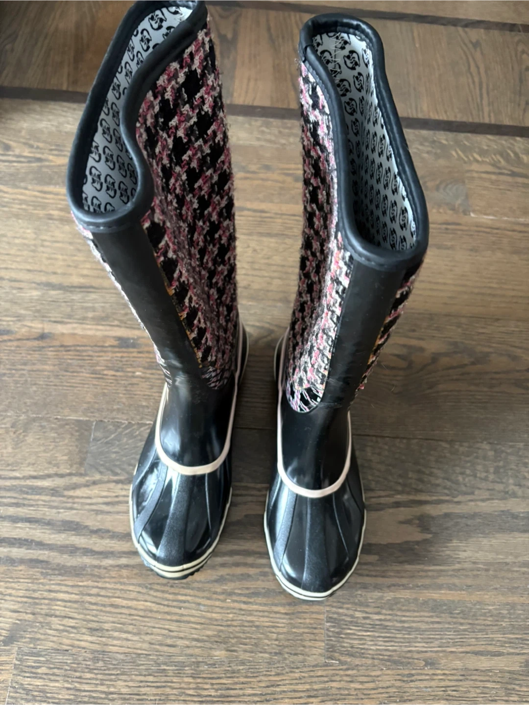 Selling a pair of Sorel rain boots! They feature a black and pink houndstooth pattern on the upper part of the boot. The lower part is black and shiny. They are waterproof and in great condition!