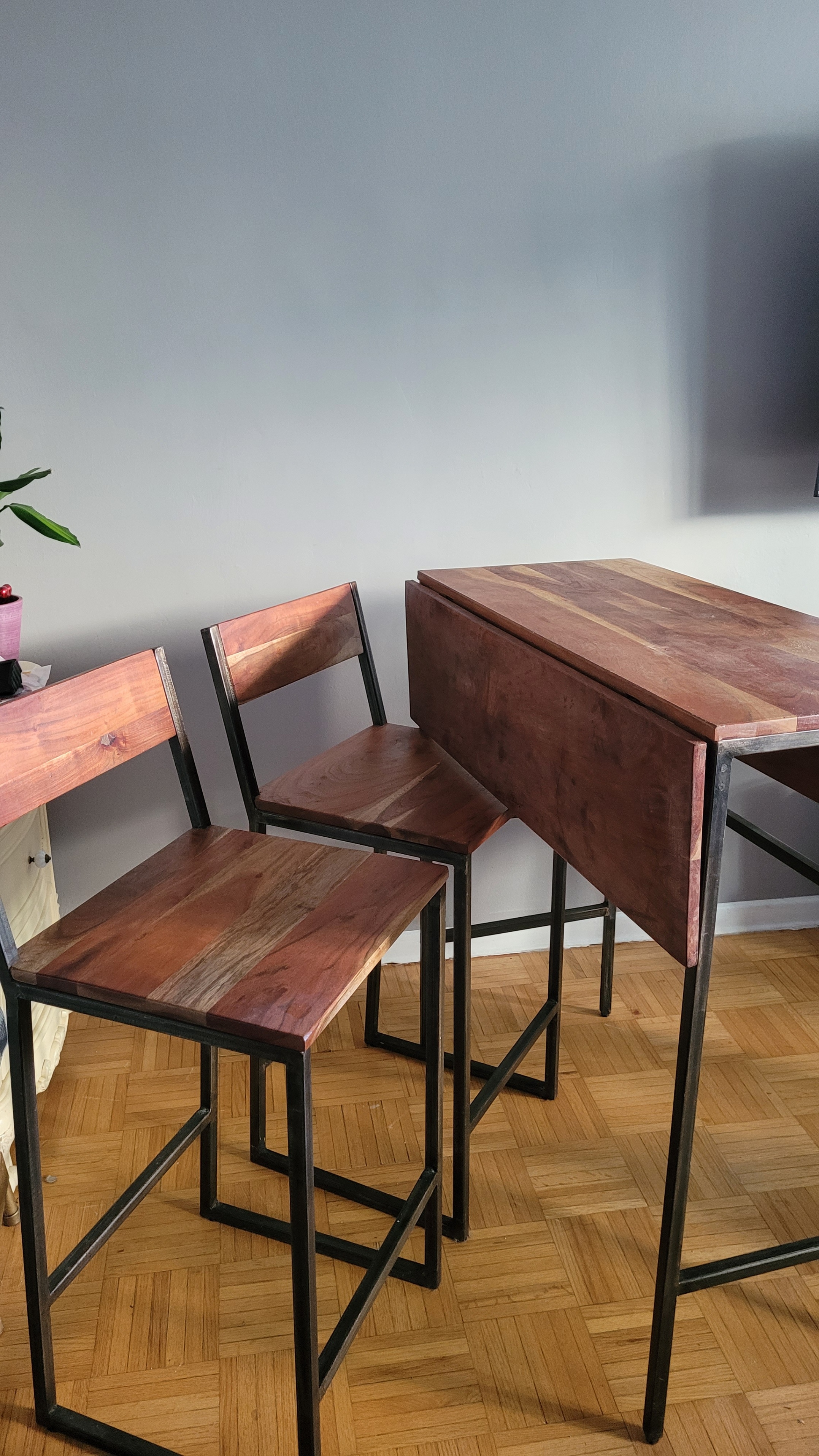Lovely sustainable mango wood/ iron frame bar table and 2 stools,