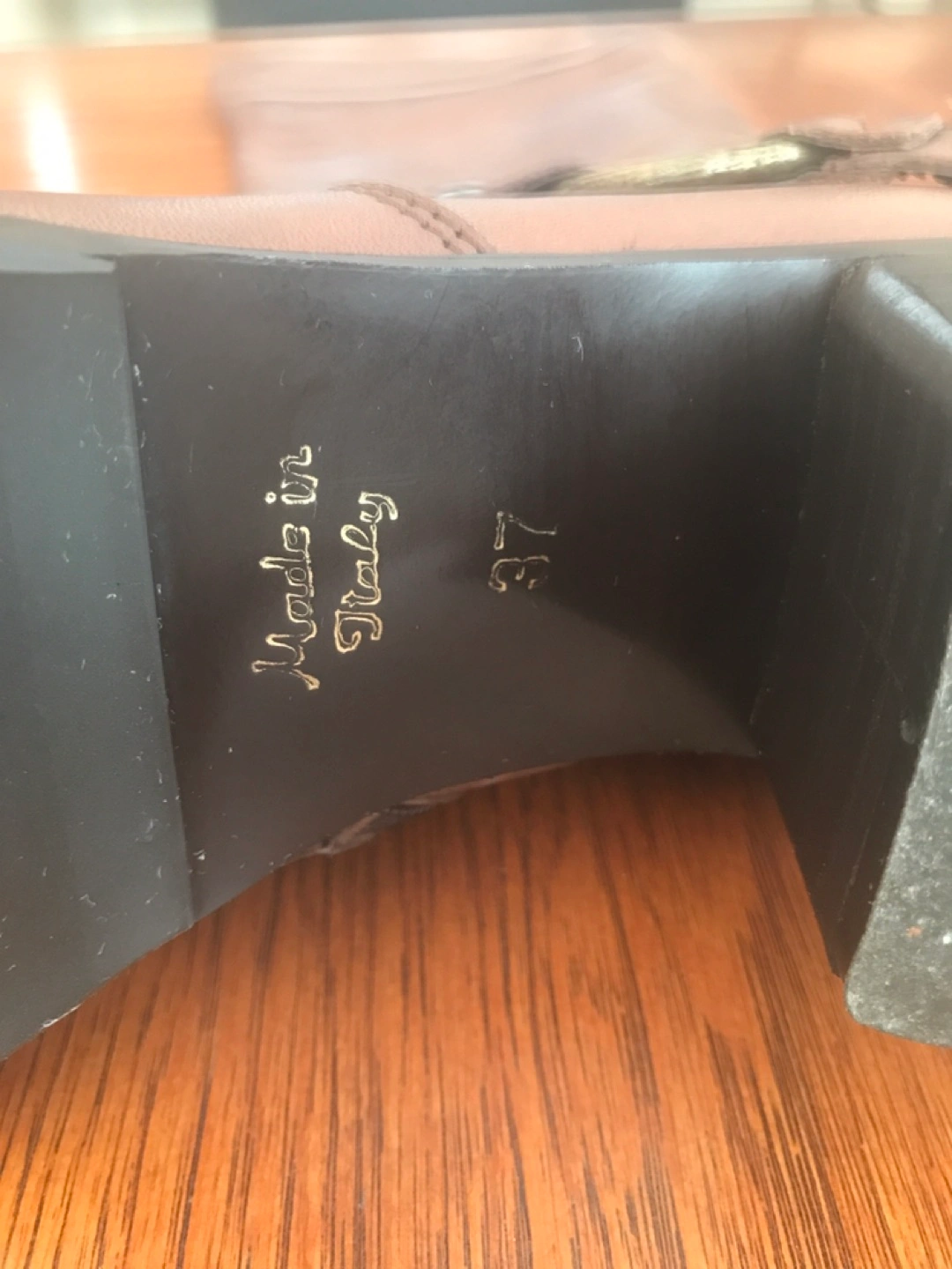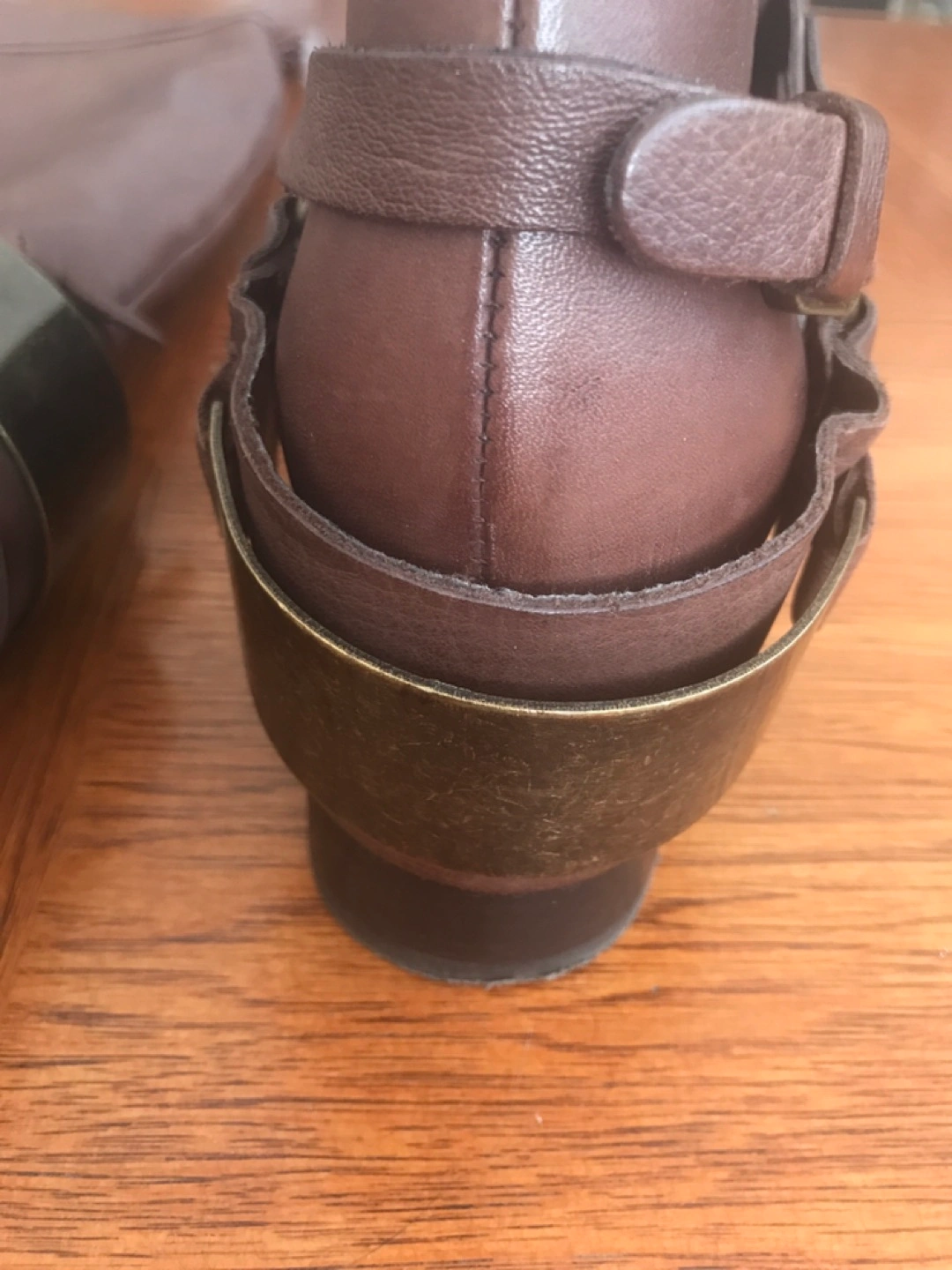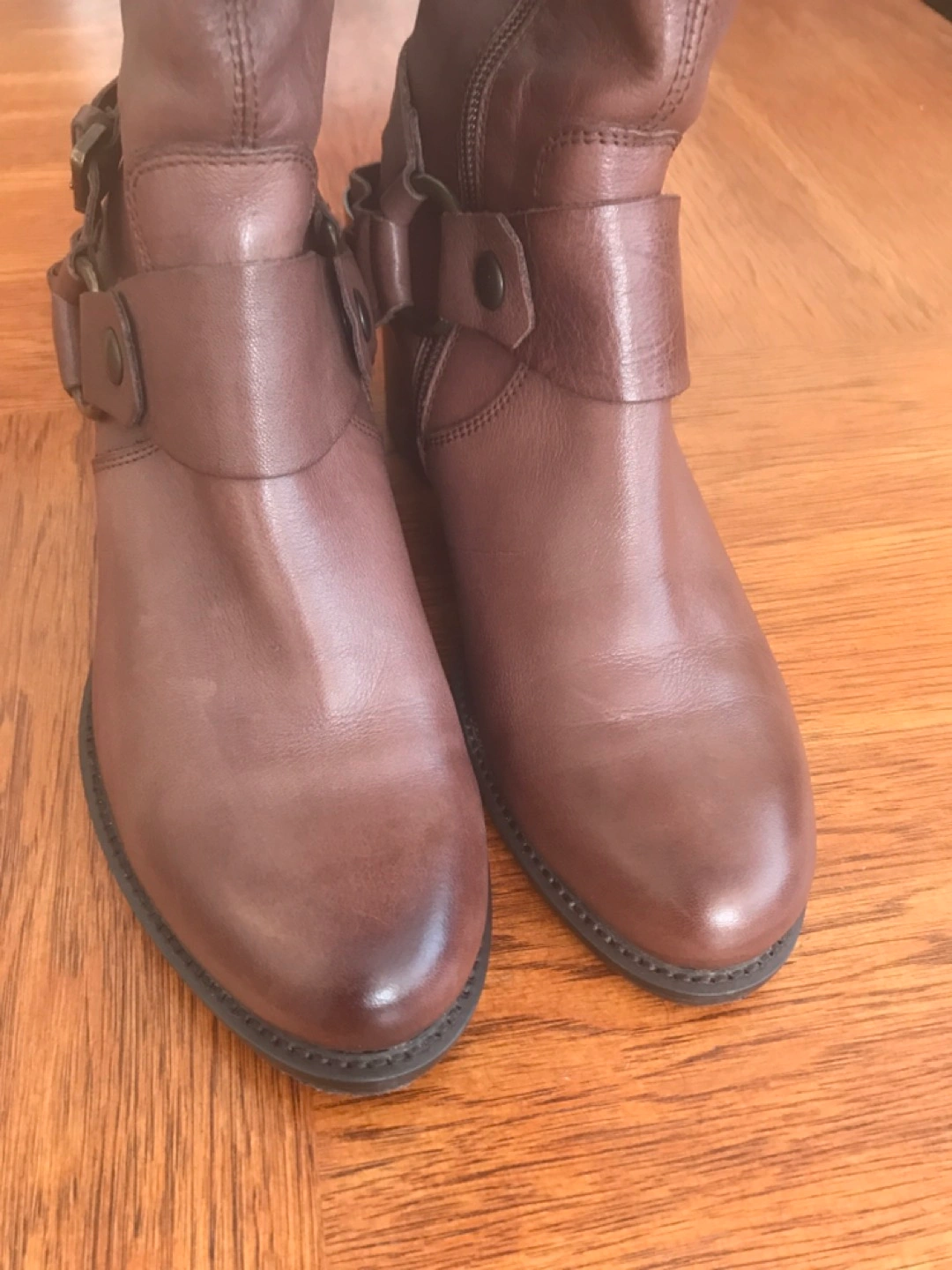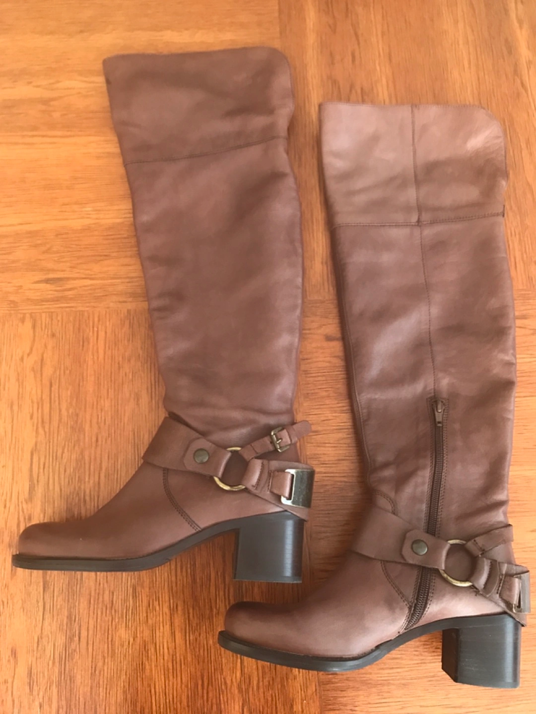 Removable harness detail, genuine leather, almond toe. Shaft measures 19”, heel height is 1.5”. Worn once.