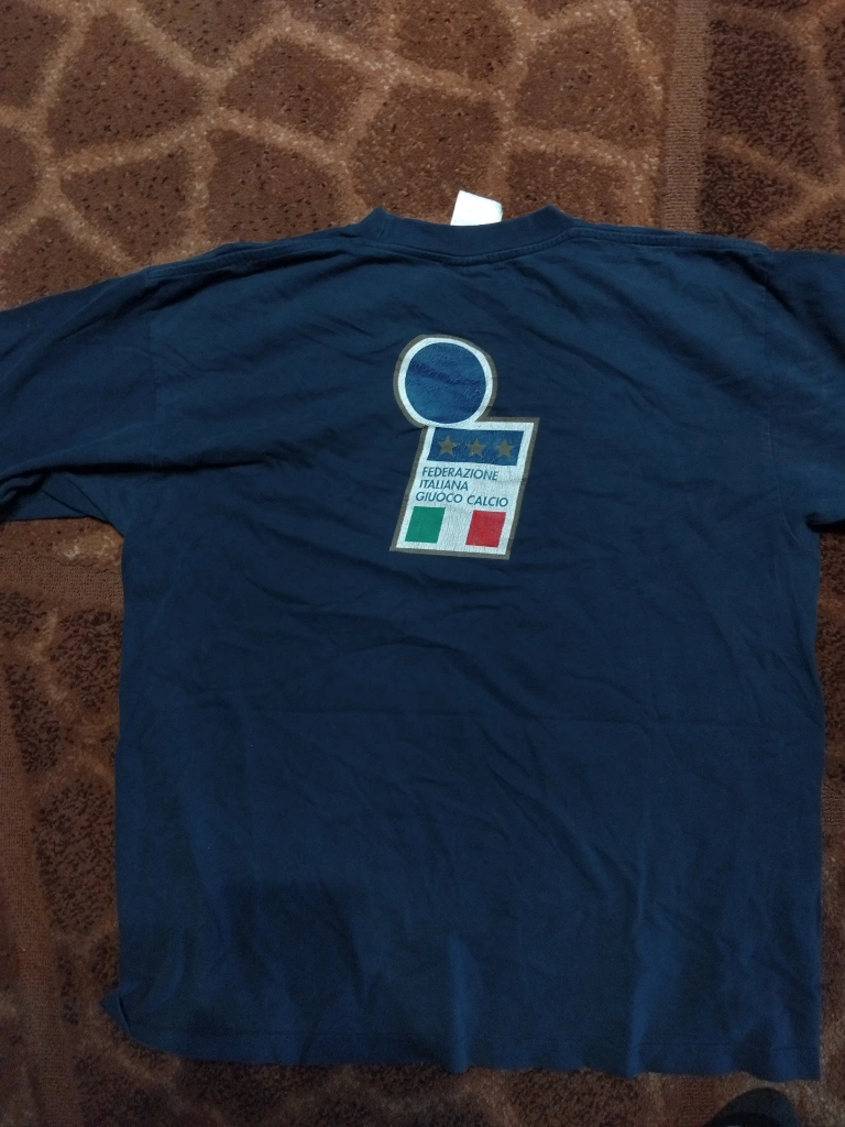 vintage Nike Italia T-shirt in good condition. The shirt is blue with a white Nike logo and the word "ITALIA" printed on the front. On the back, it features a design related to the Italian Football Federation.