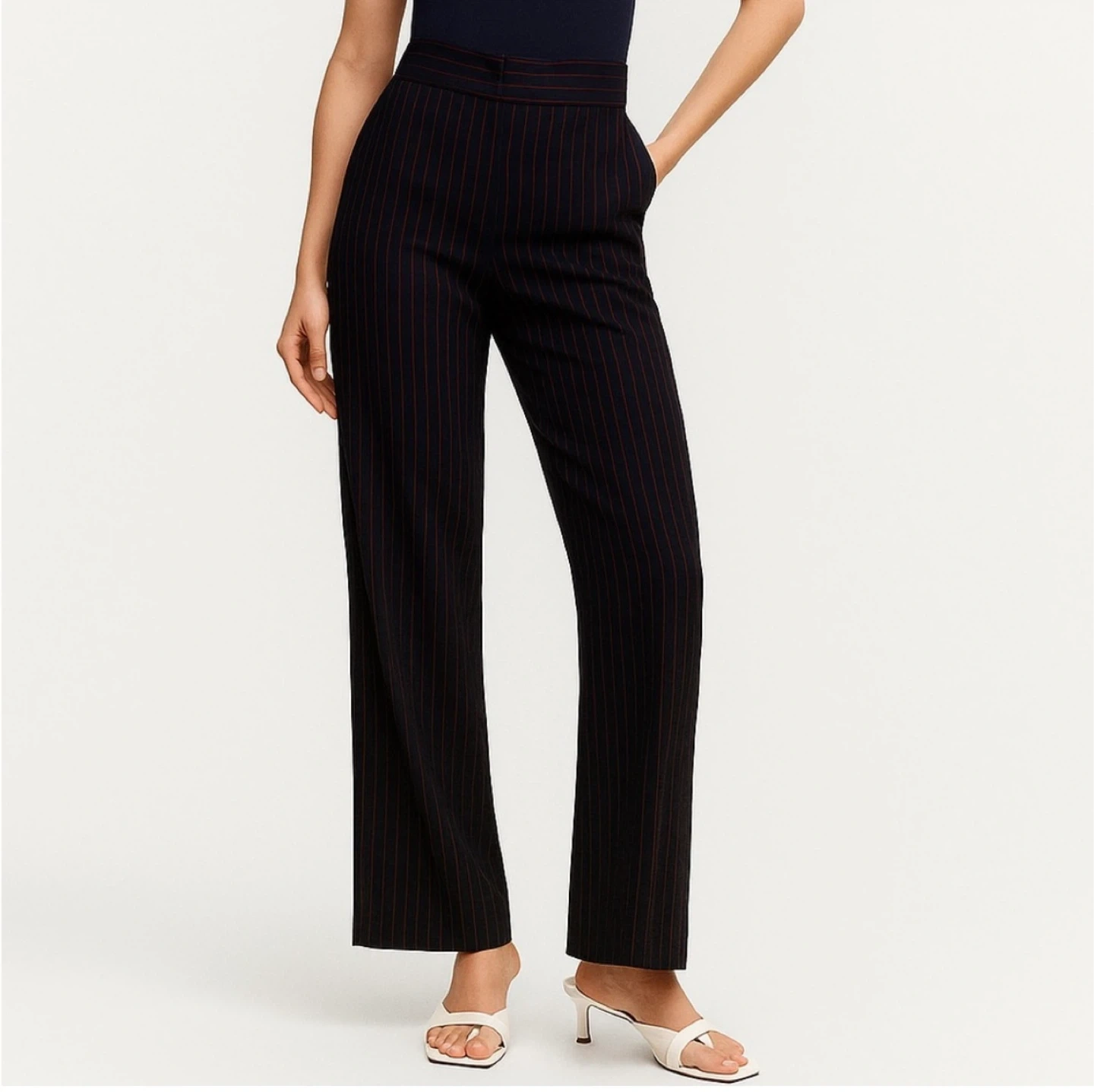 Selling a pair pinstripe wide-leg trousers. They're a stylish addition to any wardrobe! The pinstripe design adds a touch of sophistication, and the wide-leg cut is both comfortable and on-trend