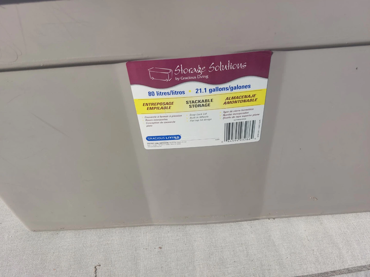 Selling a Gracious Living Storage Solutions bin. It's in great shape and ready to help you organize! It holds 80 litres/21.1 gallons and is stackable for easy storage