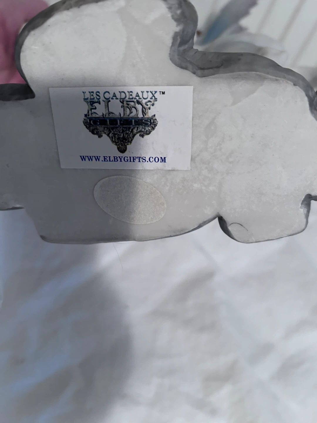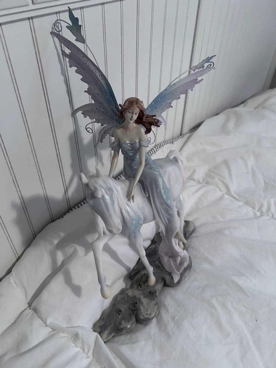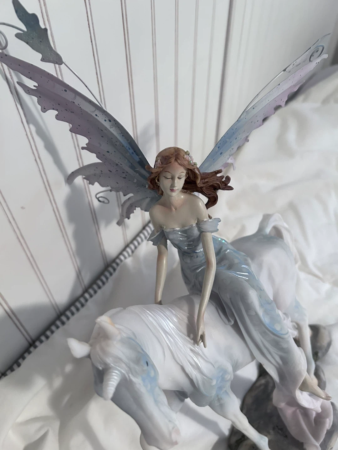 This Les Cadeaux figurine depicts a fairy gracefully riding a unicorn. It's a detailed piece with iridescent wings and flowing gown. Beautiful for display!