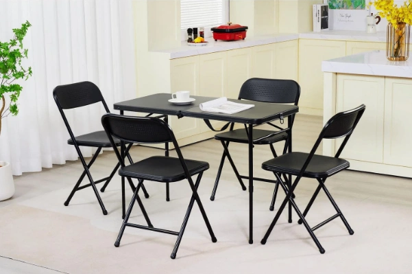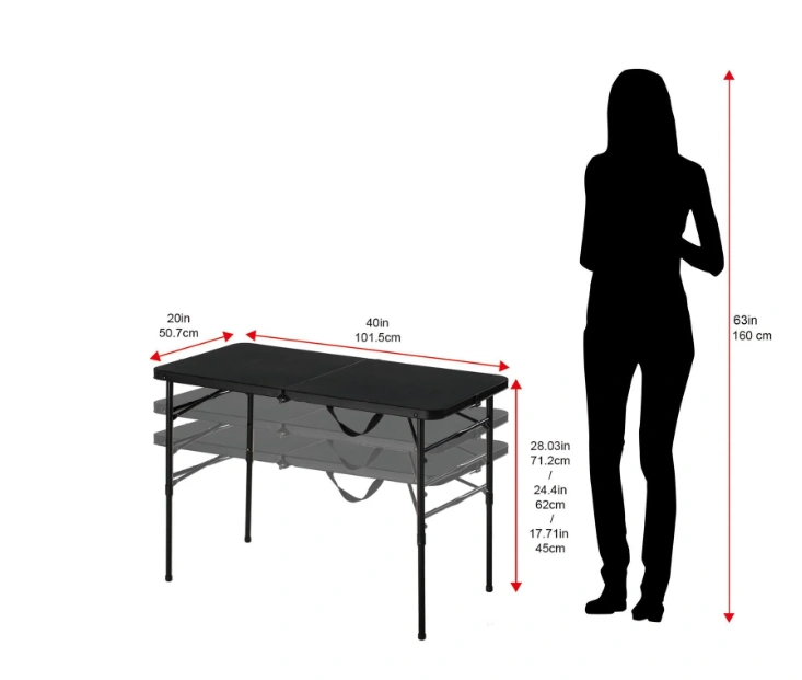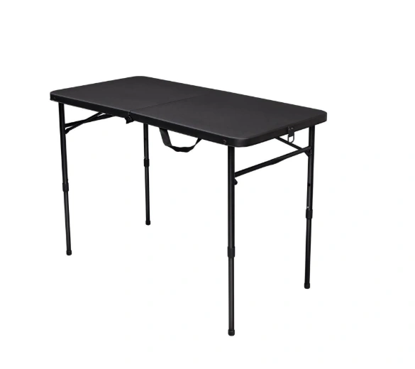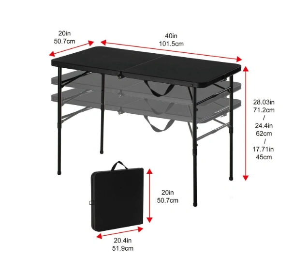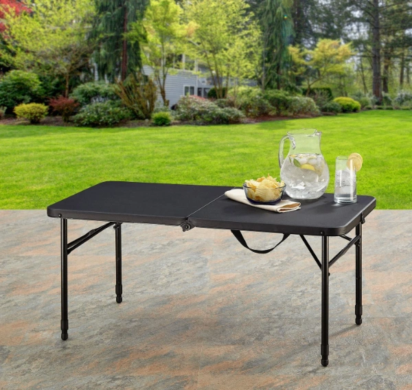 97Product Dimension: 40 in W x 20 in D x 17.71- 24.4 - 28.03 in H (101.5 cm x 50.7 cm x 45 - 62 - 71.2 cm) Comfortably seats 4 adults Easily folds in half for convenient storage Classic black color coordinates with almost any decor! Includes a built-in carry handle, for easy transportation Rubber stoppers on the legs for added grip on floor surfaces. Appropriate for use indoors or outdoors. Easy-to-clean resin surface. Strong durable powder-coated metal construction. Number Of Pieces: 1 x folding table