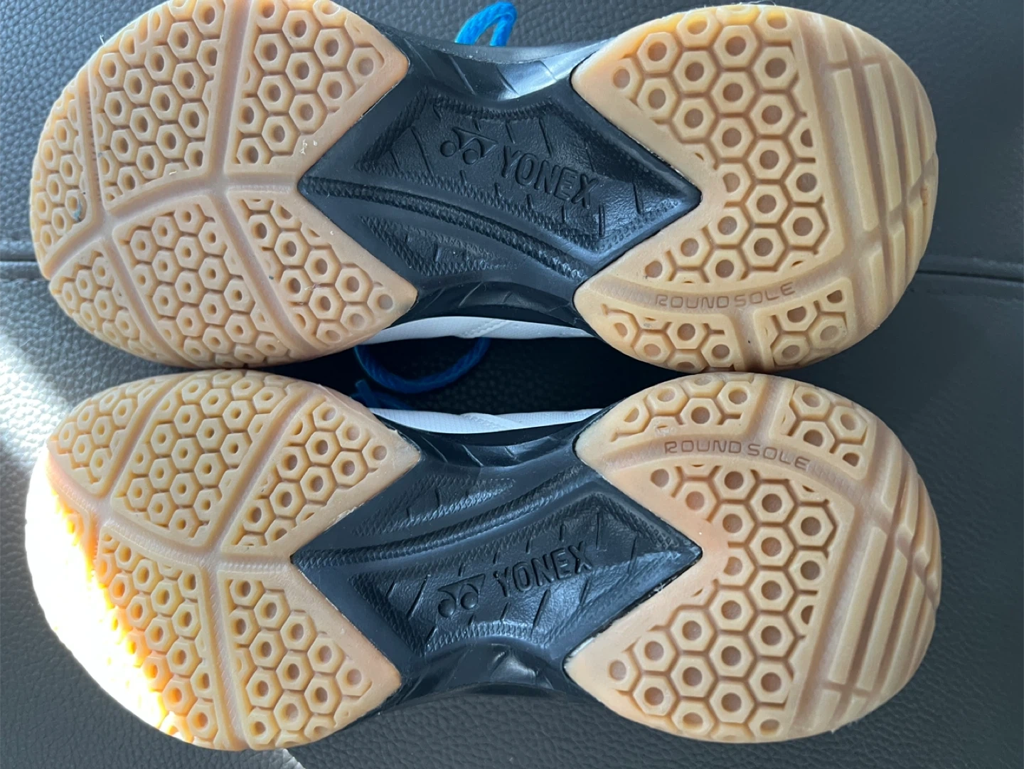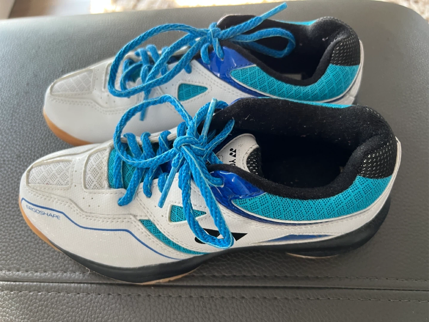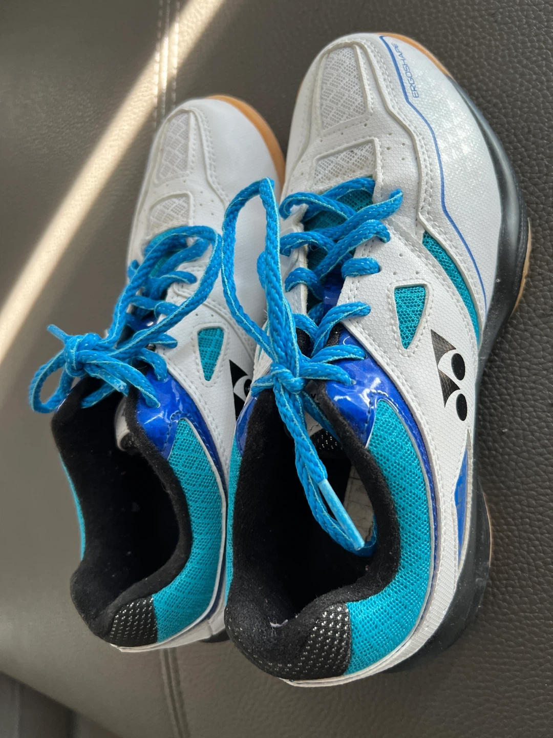 Selling a pair of Yonex badminton or squash shoes in great condition! They are white with blue accents and a black sole. The size is US kid's Size 5.0.