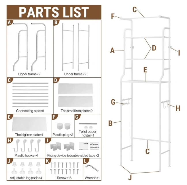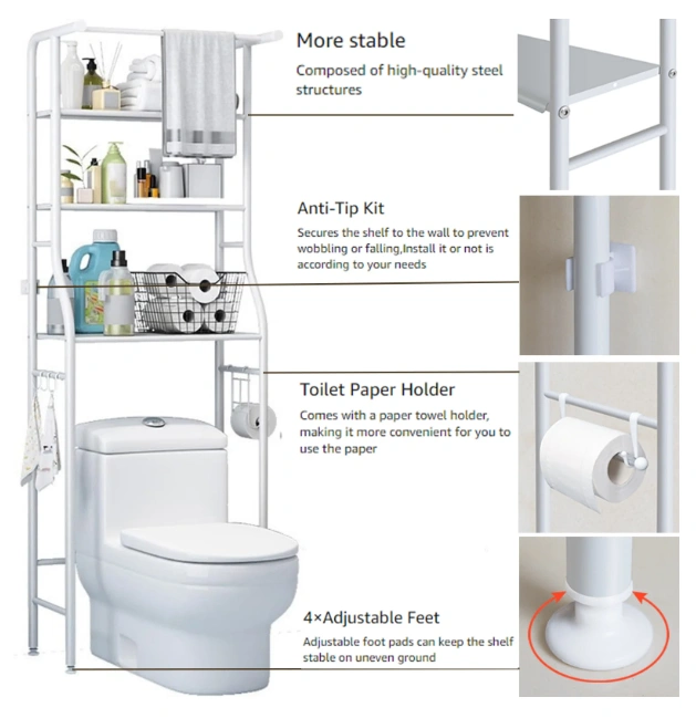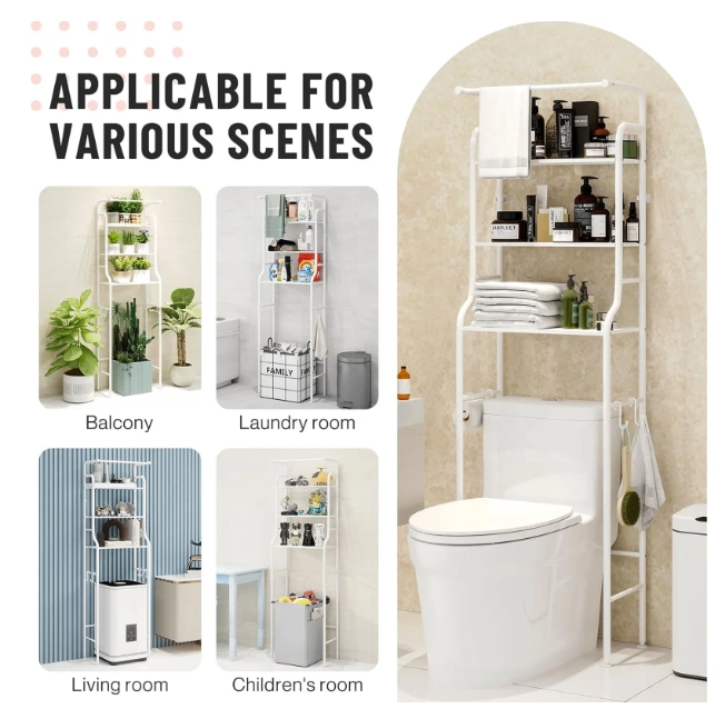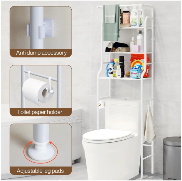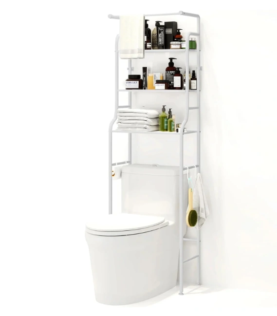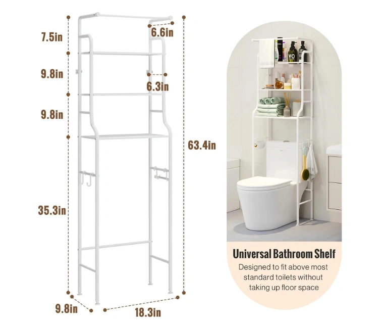 97Unique Design: Elevate your bathroom with a 3-tier shelf and towel bar for chic organization, blending style and functionality seamlessly. Space Saver: The dimensions of 63.7 x 18.3x 9.8 inches. Maximize storage efficiency with a design that fits over most toilets, optimizing every inch of your bathroom space. Easy Installation: Enjoy a hassle-free setup—nail-free, drill-free, and easily movable, allowing for flexible placement according to your preferences. Sturdy Build: Crafted with thickened iron poles, this storage rack is waterproof and durable, ensuring long-lasting stability in humid bathroom environments. Multi-functional: Beyond toiletries, it's a versatile solution for your laundry room, adding functionality and organization to different spaces in your home. Dimensions: 18.3"L x 9.65"W x 64"H Distance between each shelf is 10” Bottom shelf is 35" from the floor Fits over most standard toilets Holds up to 10 pounds per shelf Finish: Painted Assembly required Hardware included