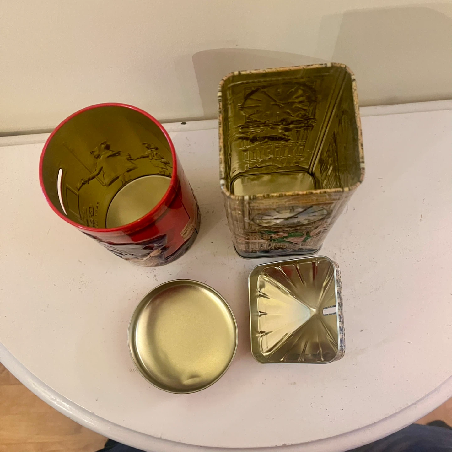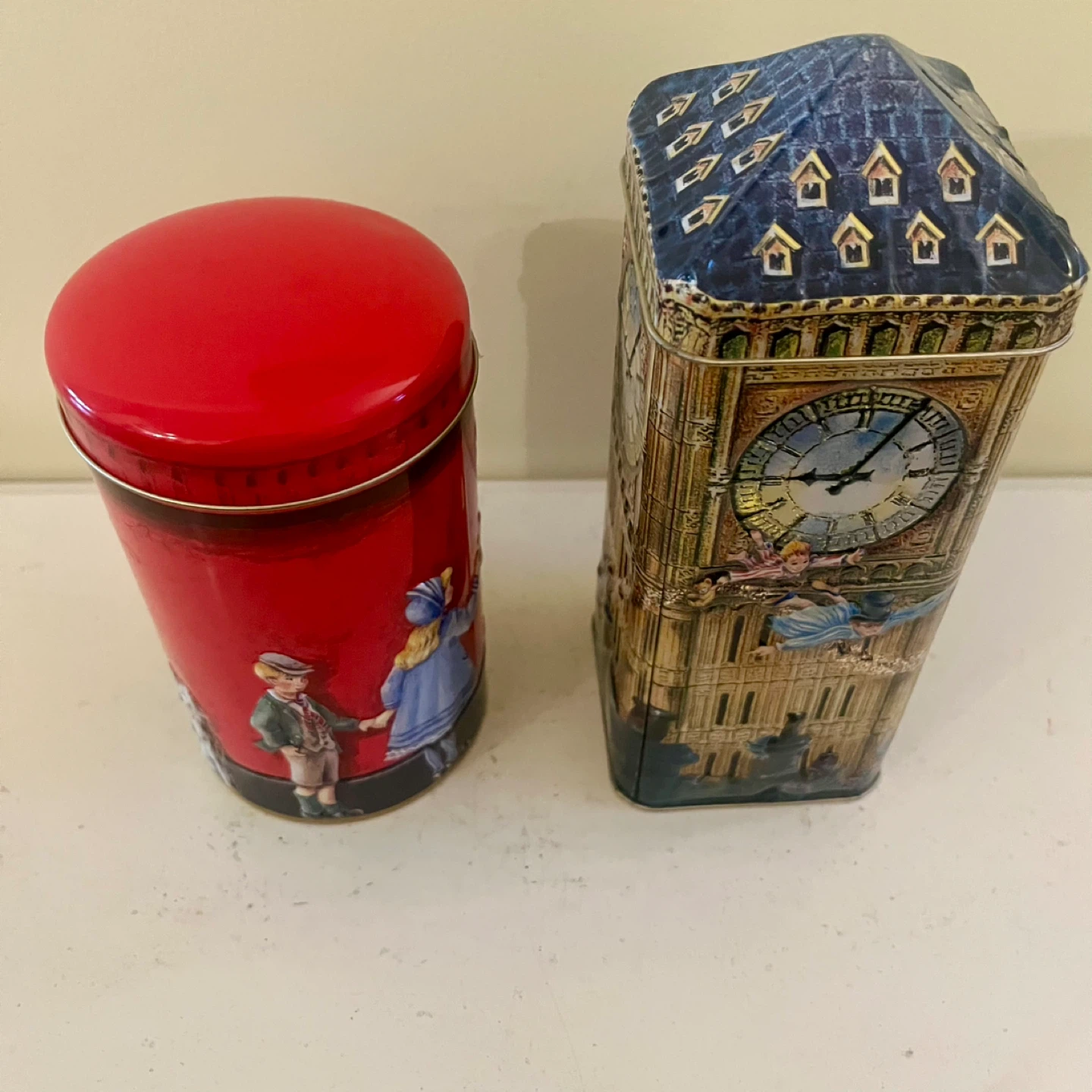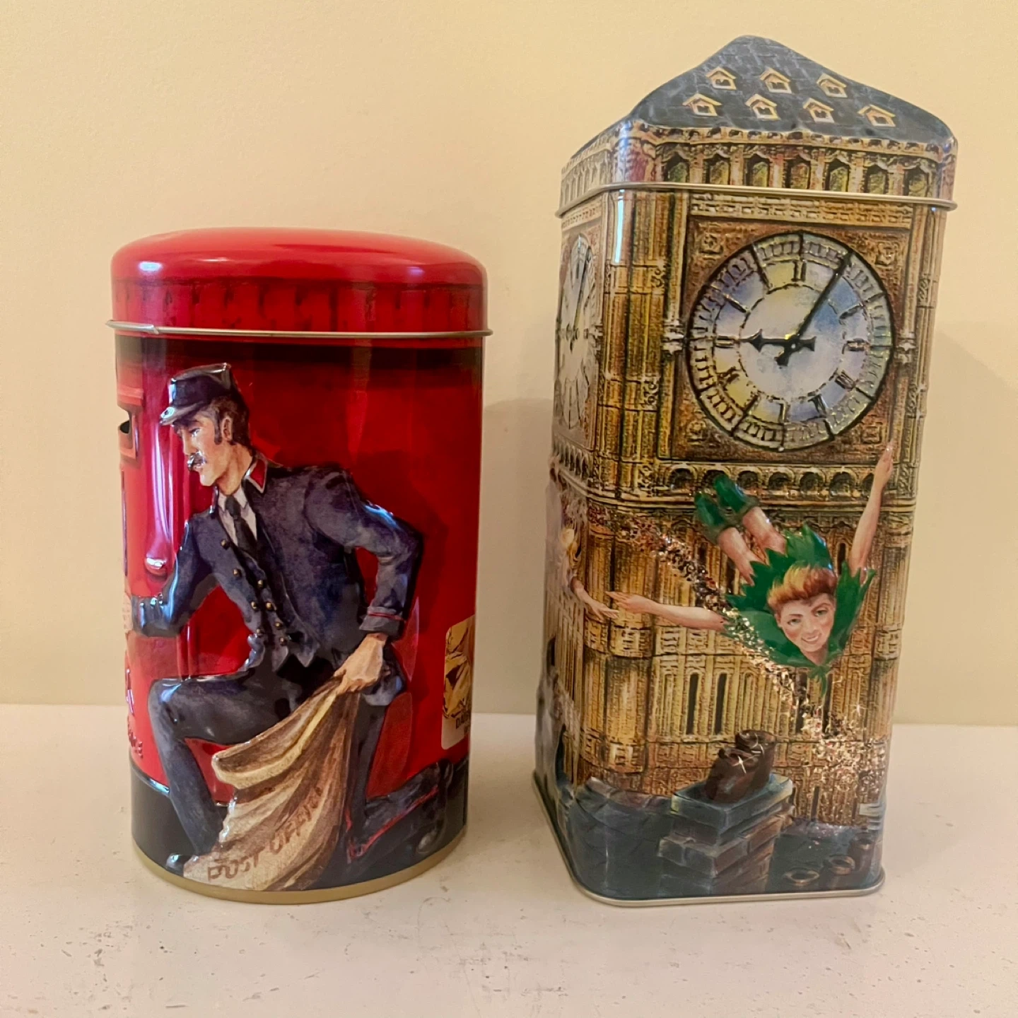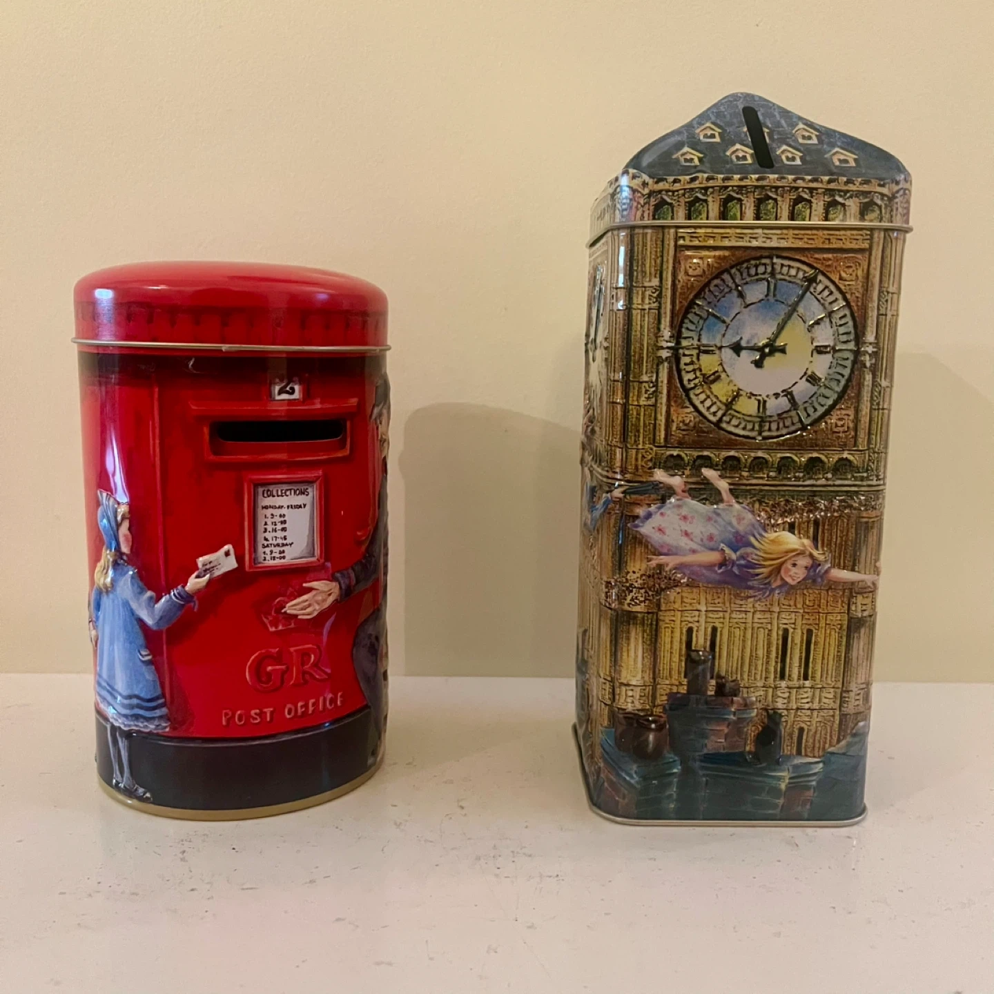 Pair of Churchill's of London novelty tins which can also be used as money boxes. One tin is shaped like a British Postbox and the other tin is shaped like Big Ben and depicts Peter Pan. These collectable tins are in excellent condition.