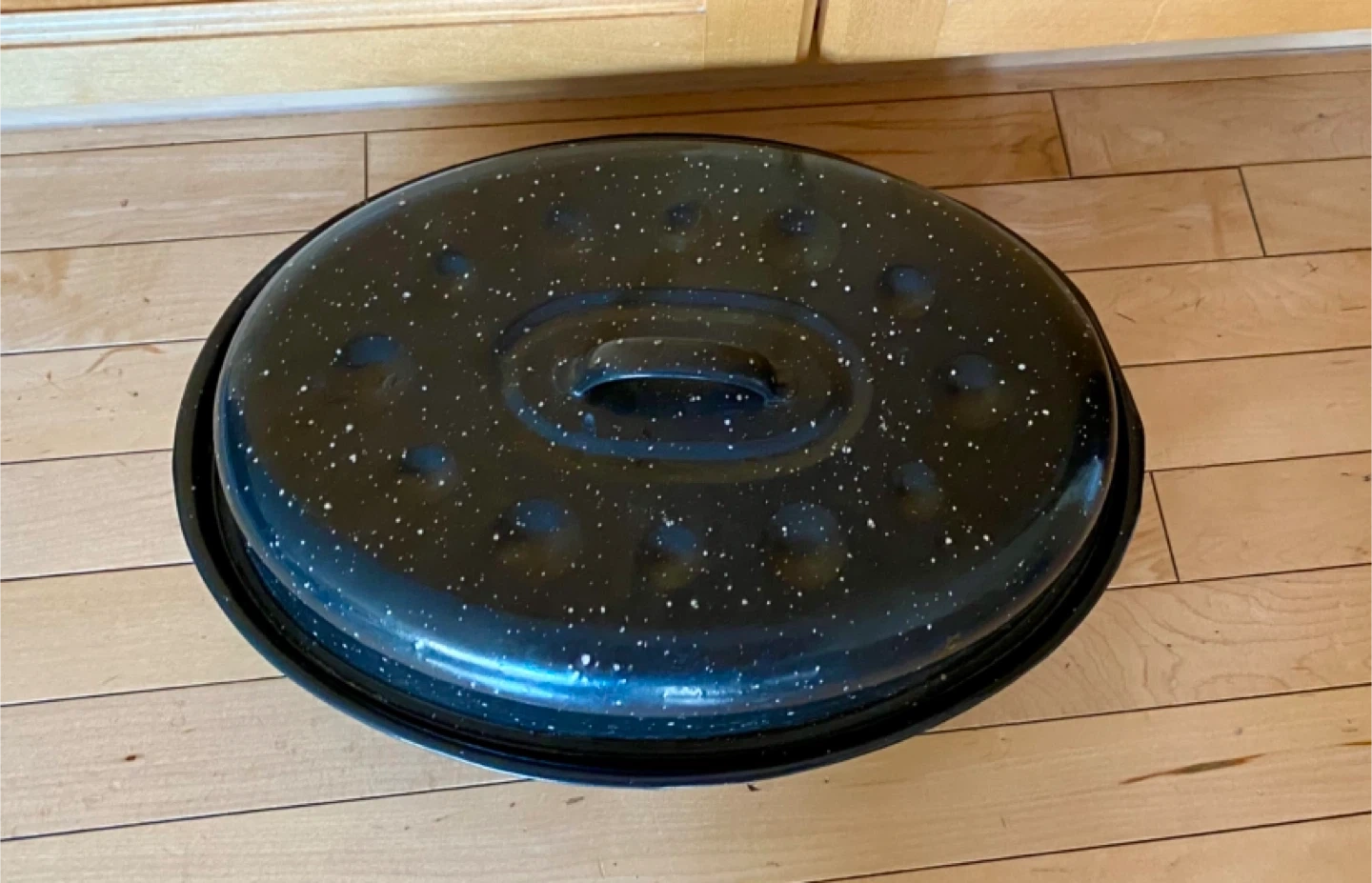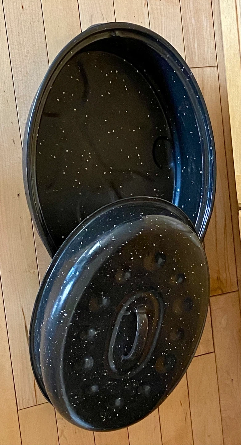 Selling a Granite Ware oval roaster, perfect for roasting poultry or larger cuts of meat. It's in great shape and ready for holiday cooking! It’s medium size pot.