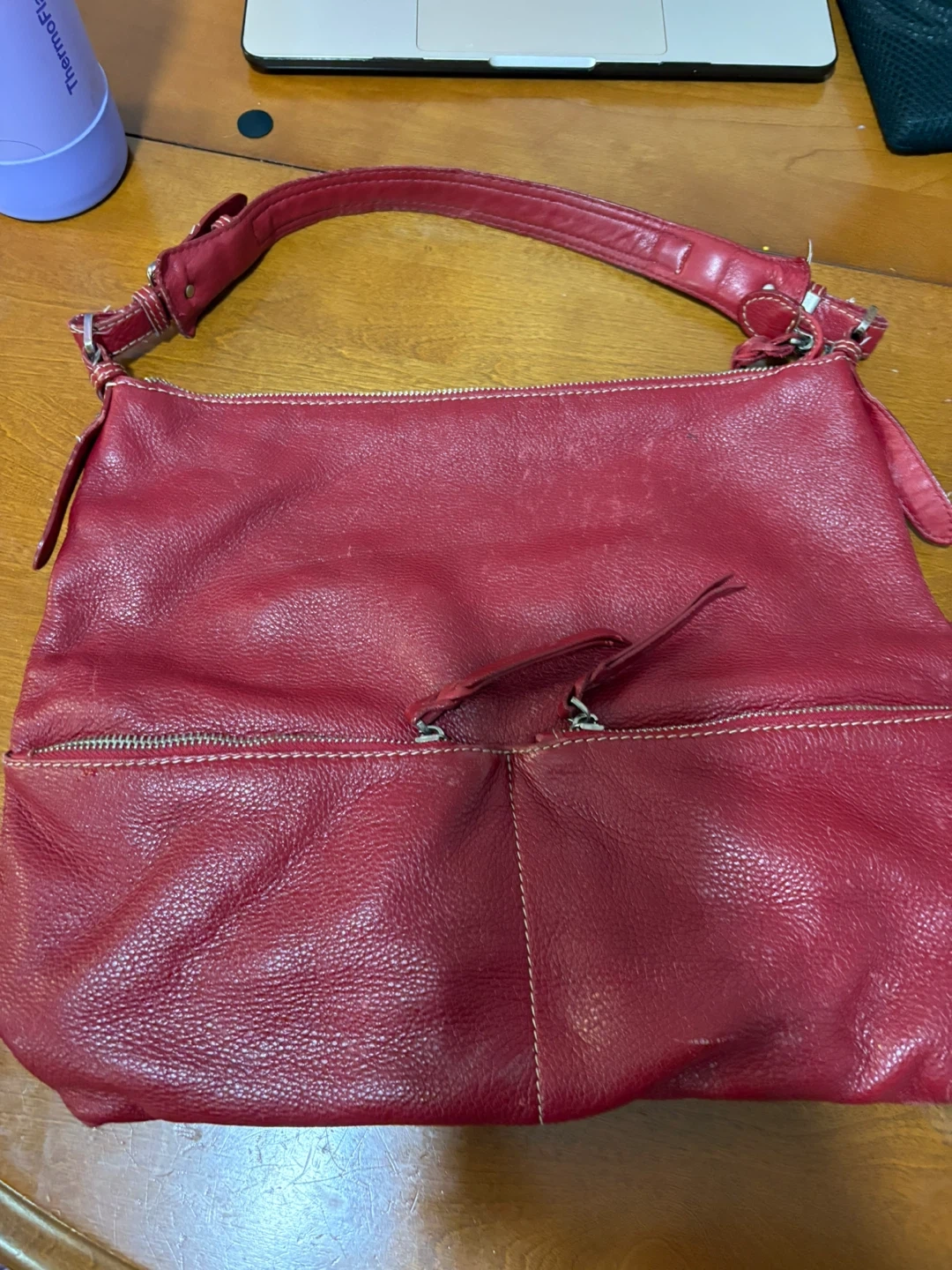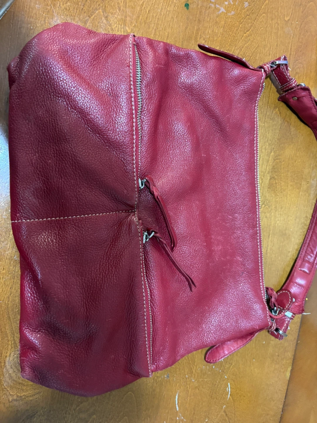 Red leather shoulder bag from Danier. Please note it has damages, (e.g piling, stitching coming out a LITTLE & wear)