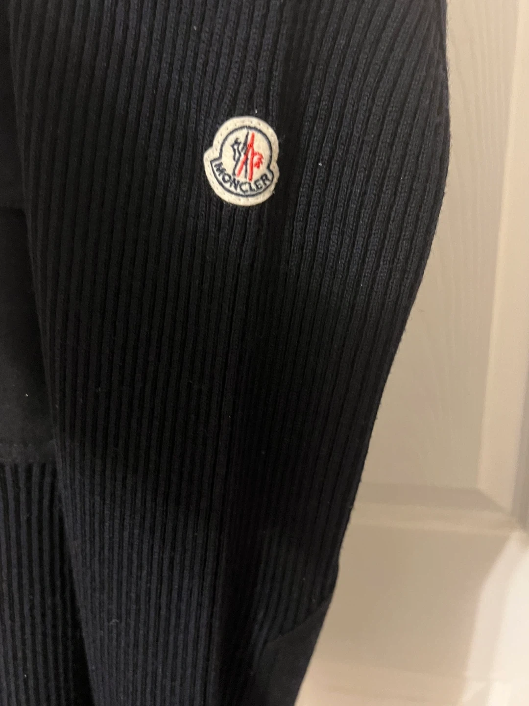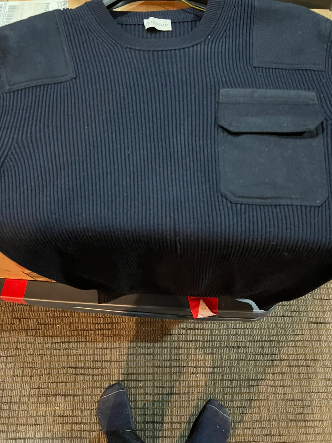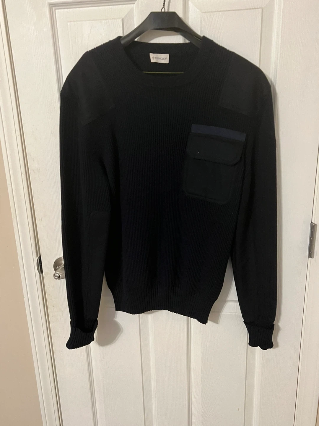 60Selling a Moncler navy knit sweater. It features a ribbed design with shoulder and pocket details. Perfect for staying warm and stylish!