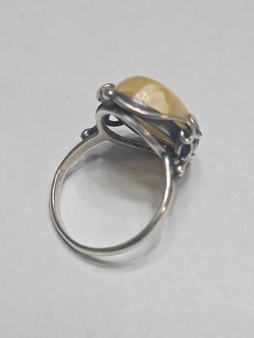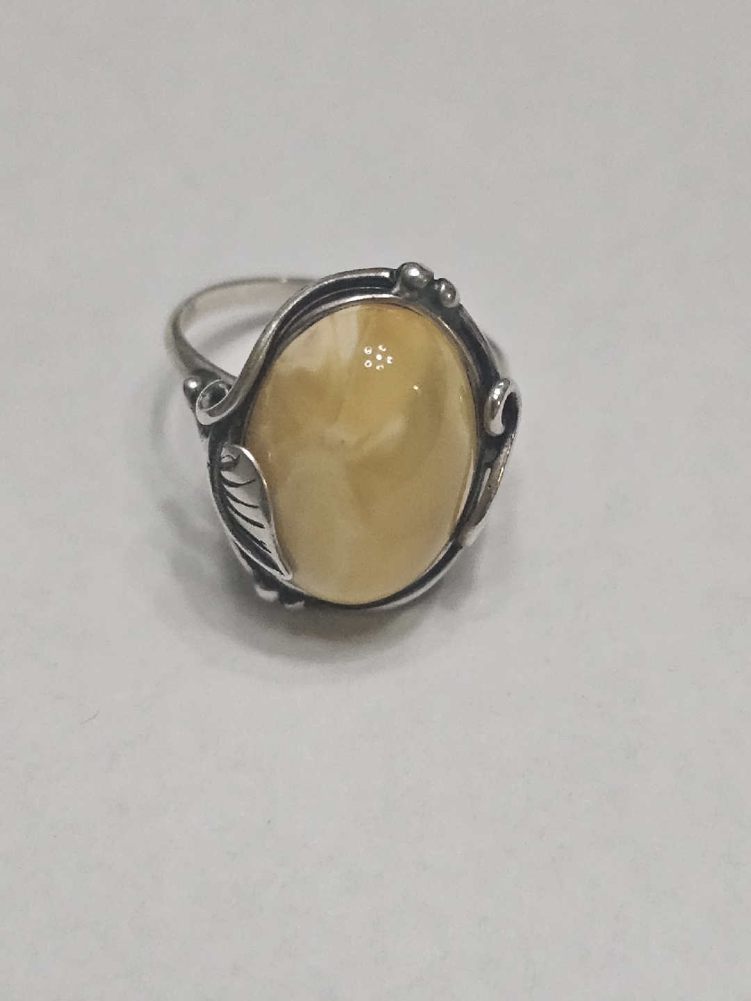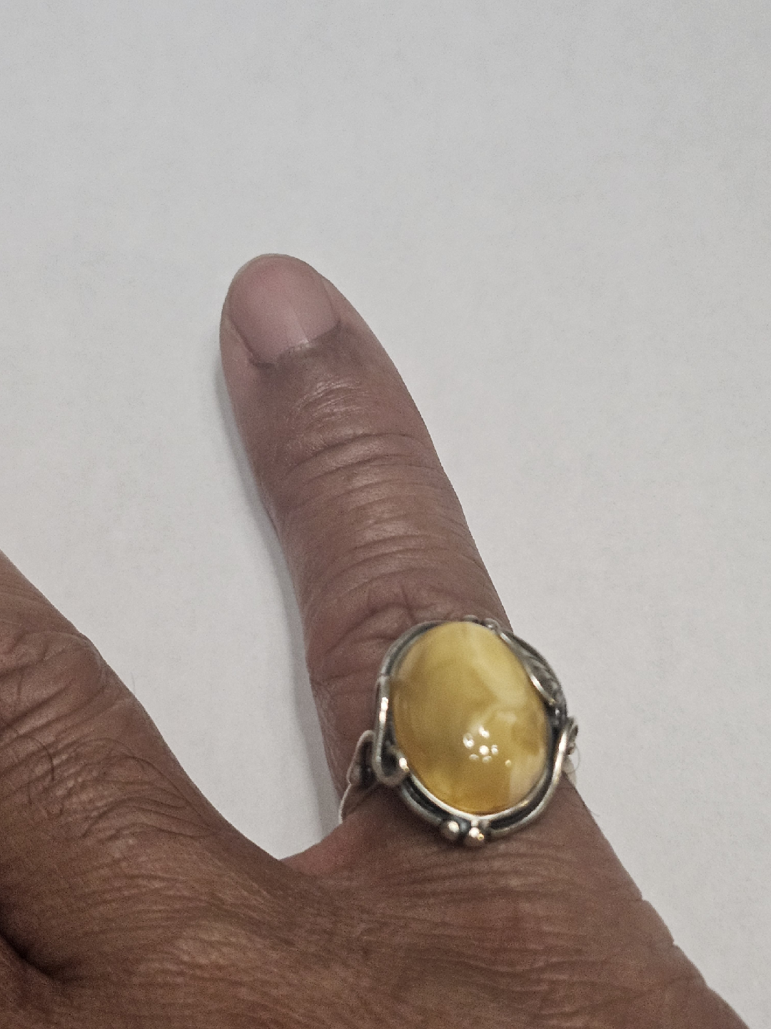 Selling a vintage amber ring stamped 925. It has a beautiful, creamy yellow amber stone set in a detailed silver setting. Perfect for adding a touch of classic elegance to any outfit!
