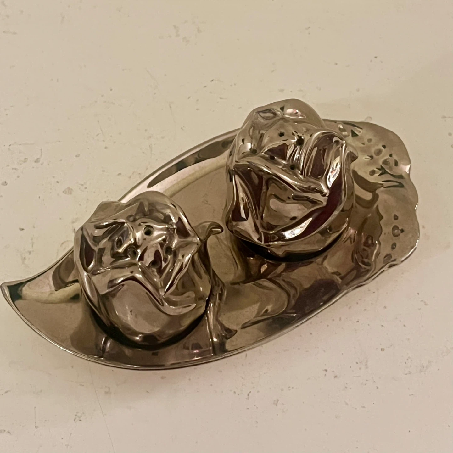Set of discontinued Royal Winton rosebud shaped salt and pepper shakers with leaf-shaped tray. This set is part of the Silver Age collection by Royal Winton, crafted in England. Height approx 2”. Excellent vintage condition.