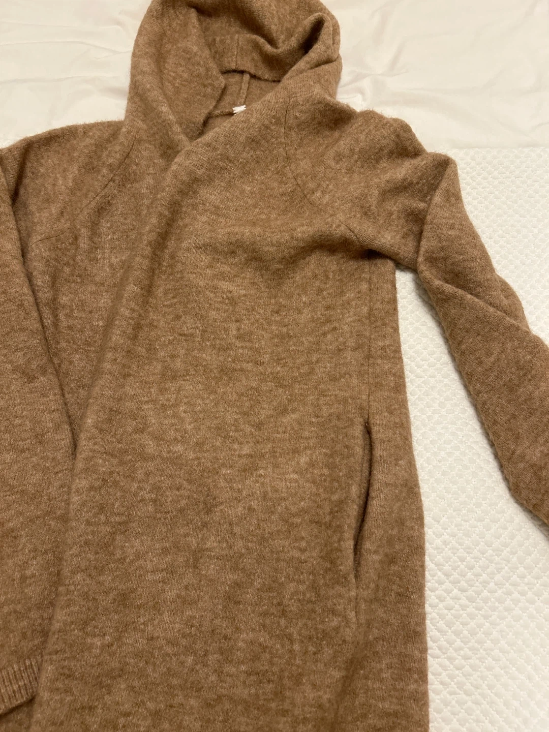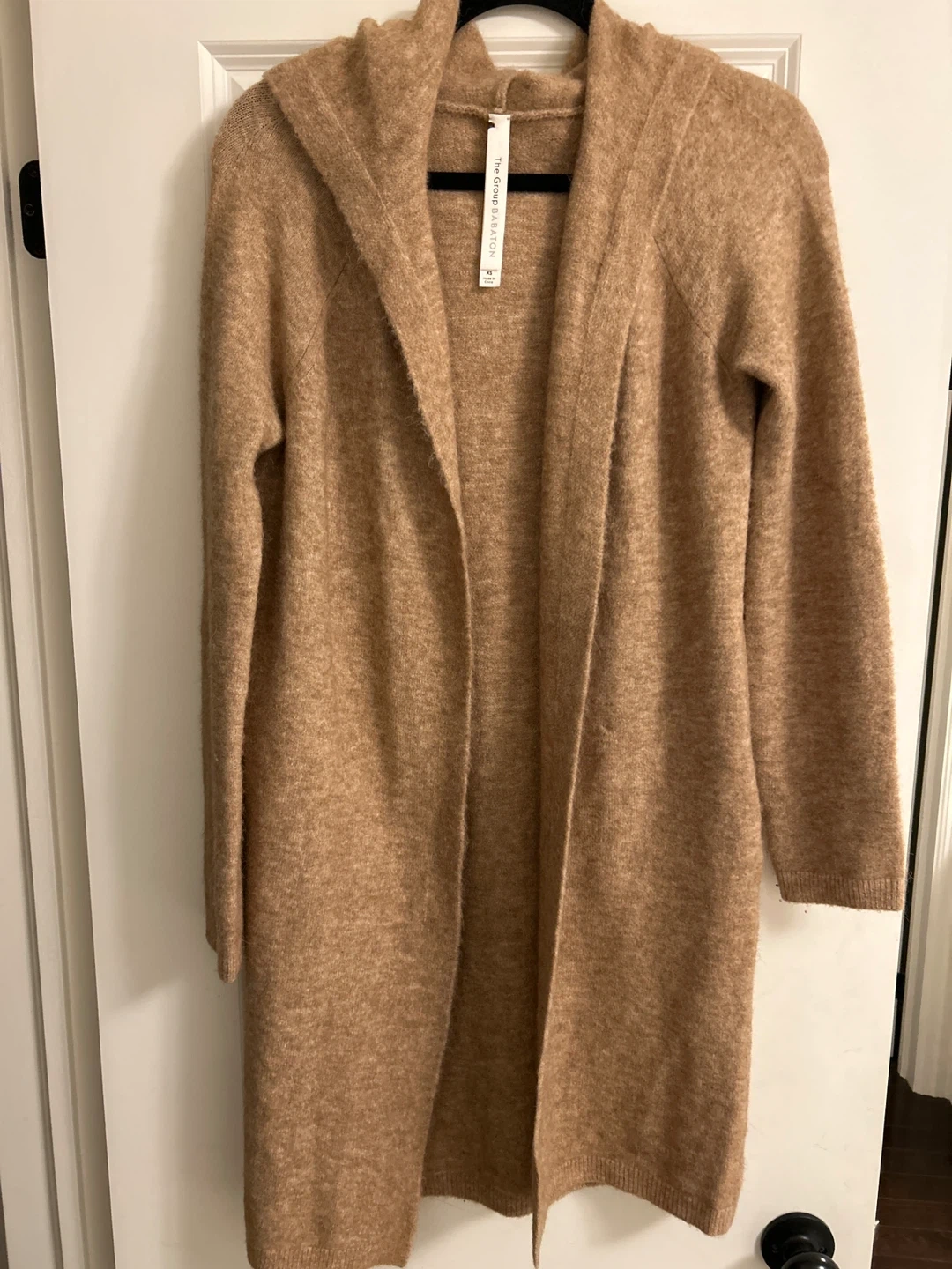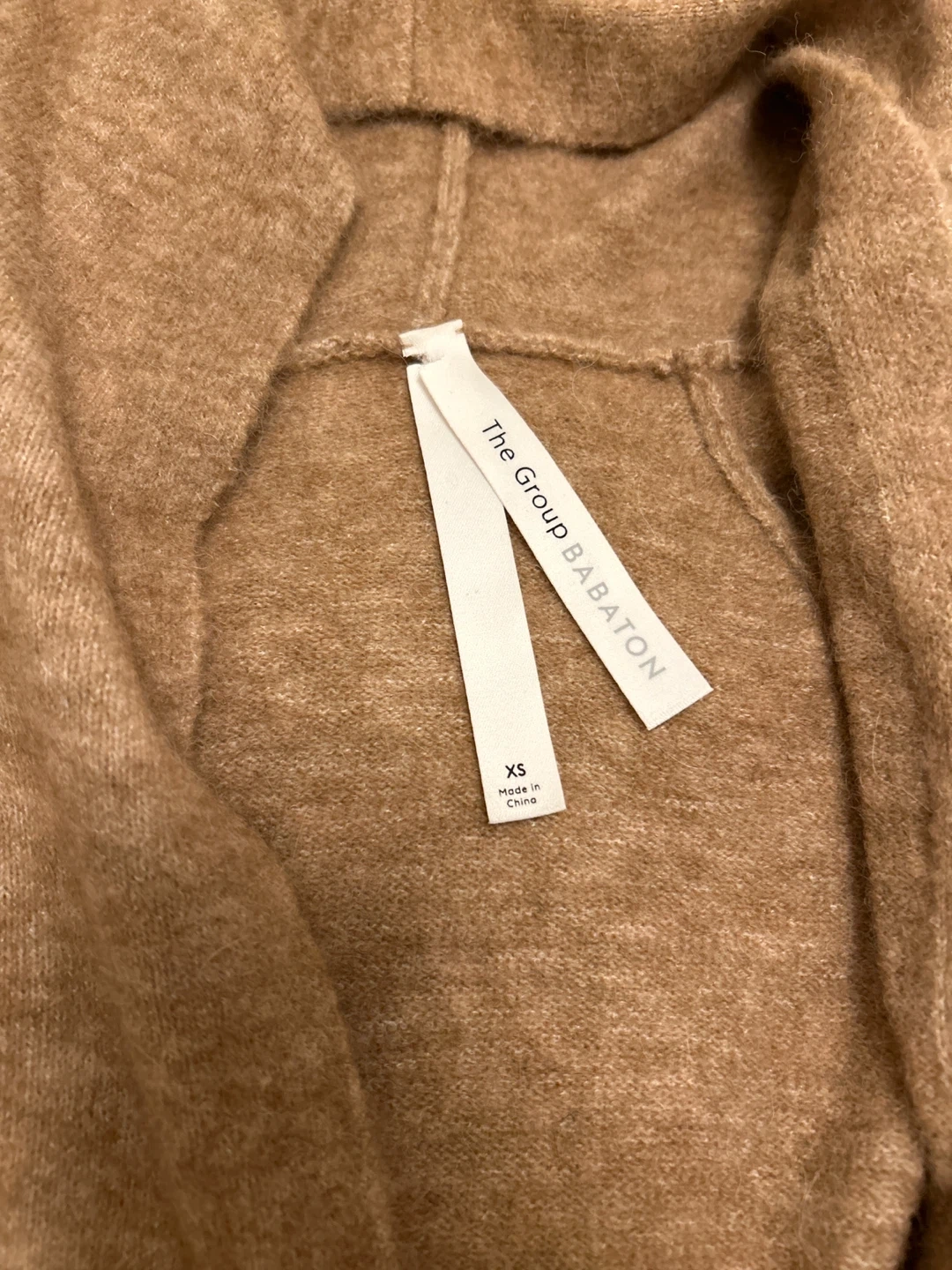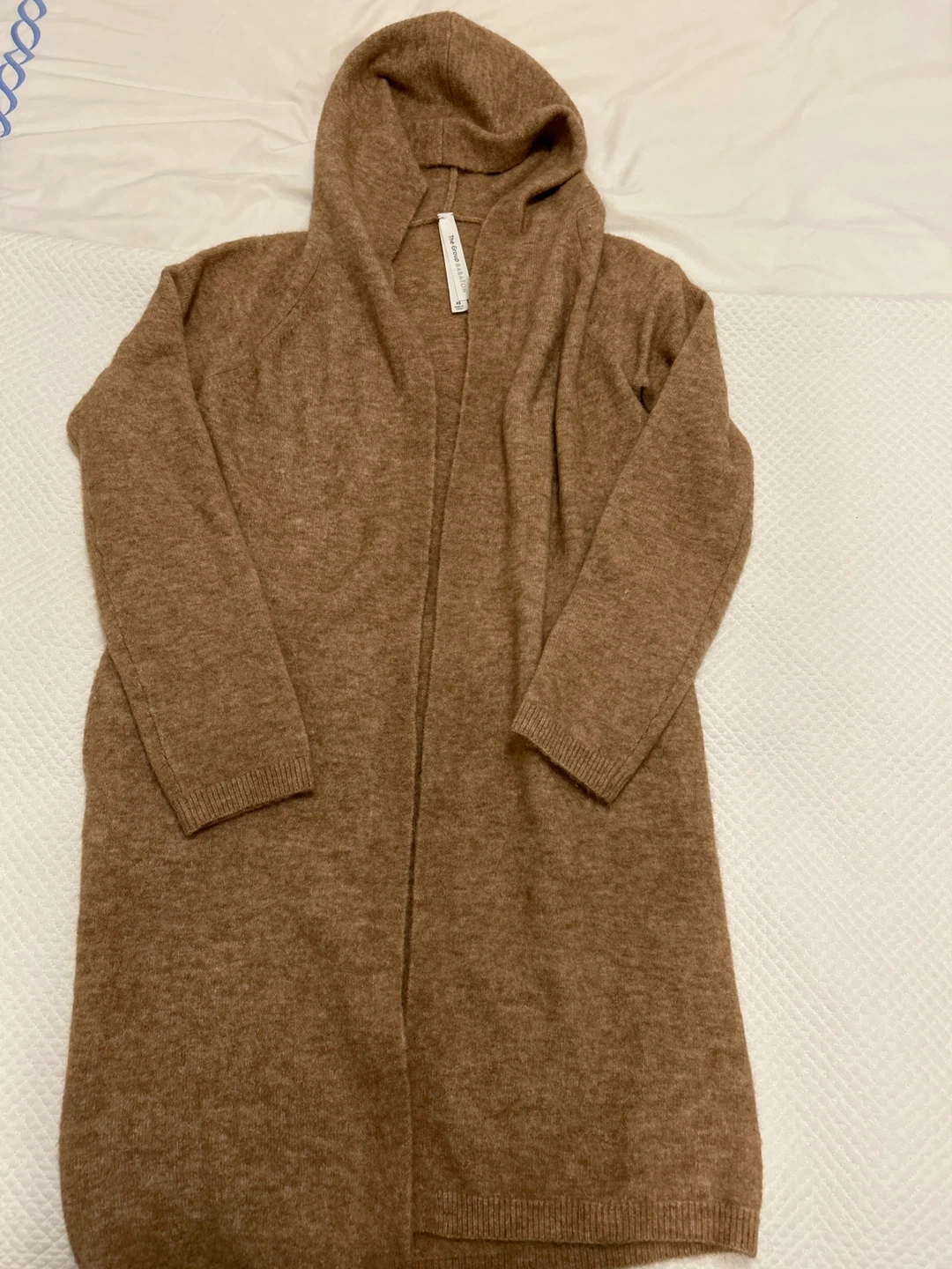 246Selling a cozy Babaton cardigan in size XS. It's a lovely neutral colour, perfect for layering! The material is soft and comfortable, great for those cooler days. It features a hood for added warmth and style and side pockets. Fits more like a small/medium.