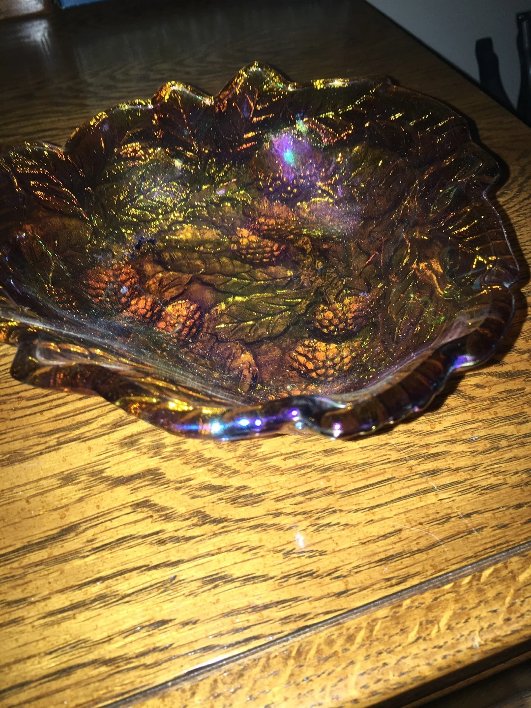 Selling a lovely vintage carnival glass bowl. It has a beautiful iridescent sheen with a pinecone and leaf pattern. Perfect for adding a touch of vintage charm to your home!